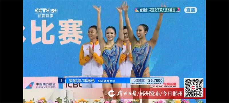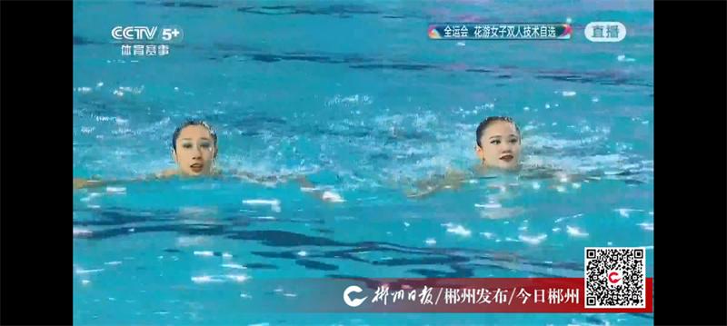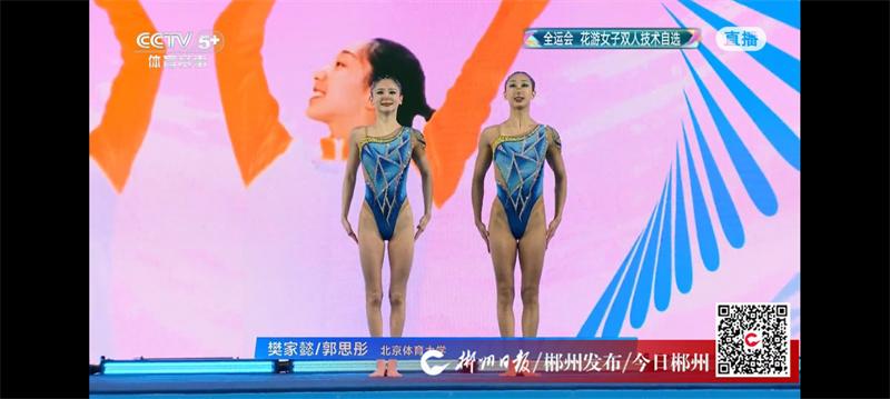 11月15日,第十五届全国运动会花样游泳女子双人技术自选决赛落幕,来自郴州的姑娘樊家懿与北京体育大学队友郭思彤携手出战,凭借精湛的技术和默契的配合斩获了铜牌。