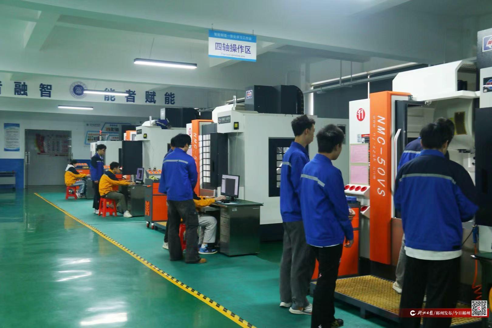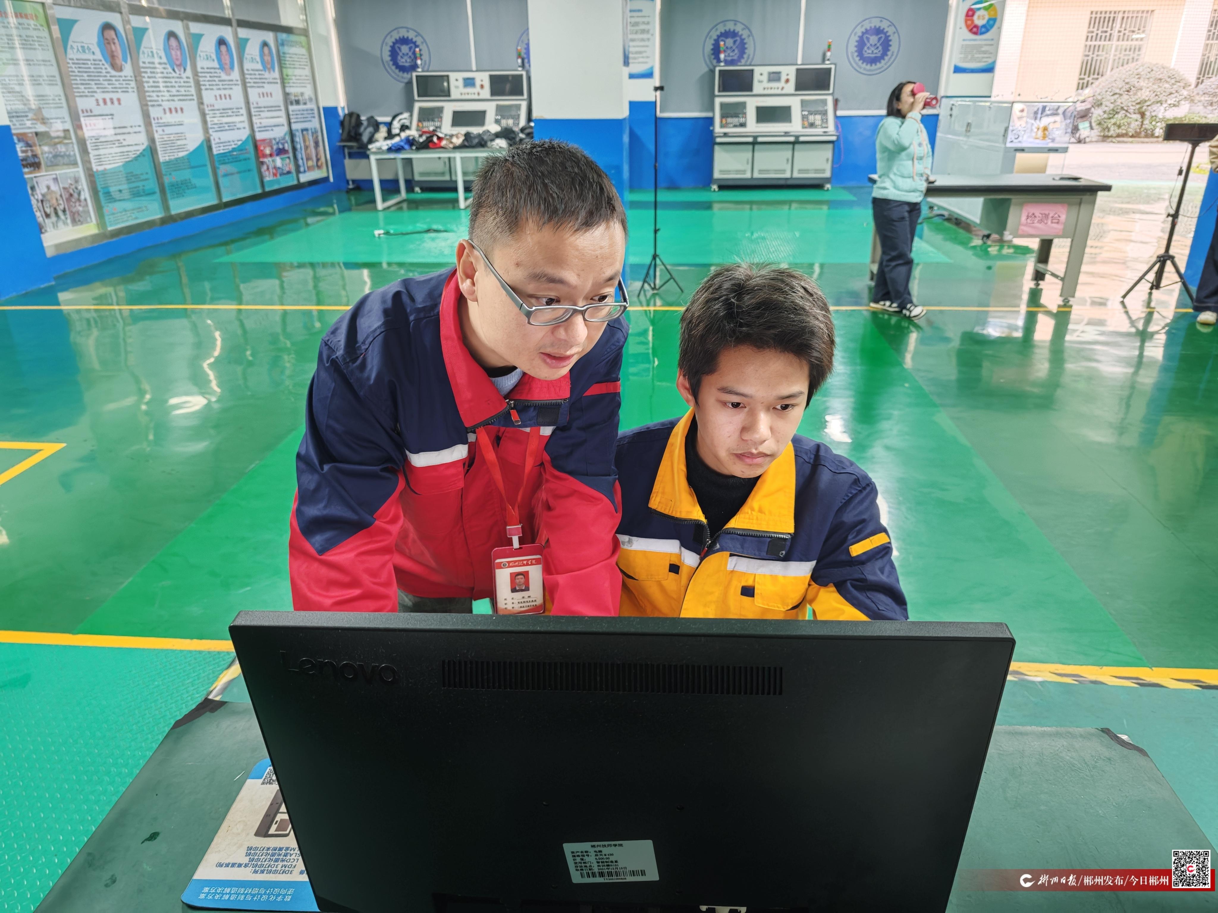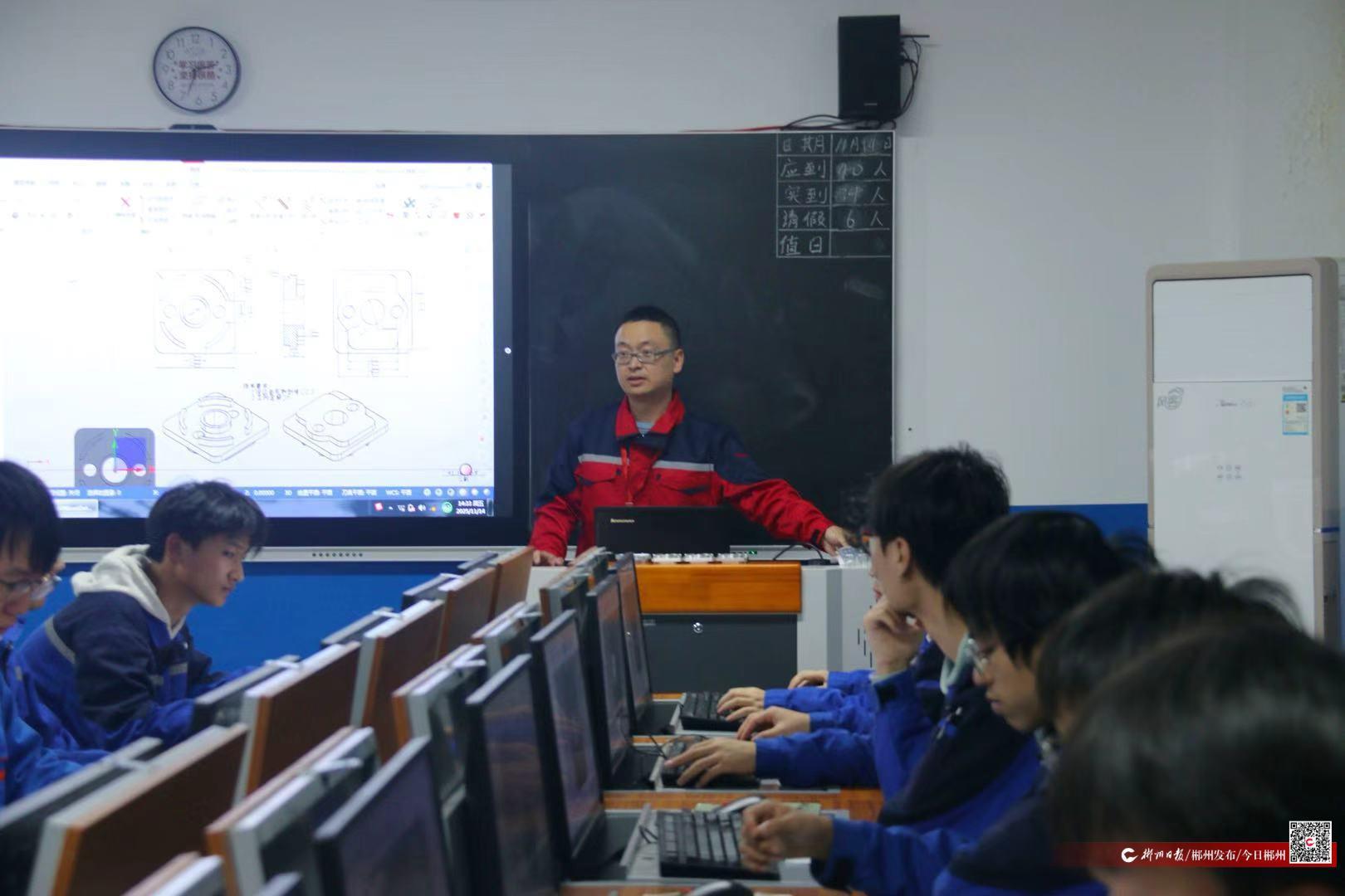 11月14日下午,郴州技师学院智能制造一体化学习工作站里一片繁忙。数控加工机床规律的运转声与清脆的键盘敲击声交织在一起,李郴穿行在各组学生之间,时而驻足指导操作,时而俯身查看加工作品。