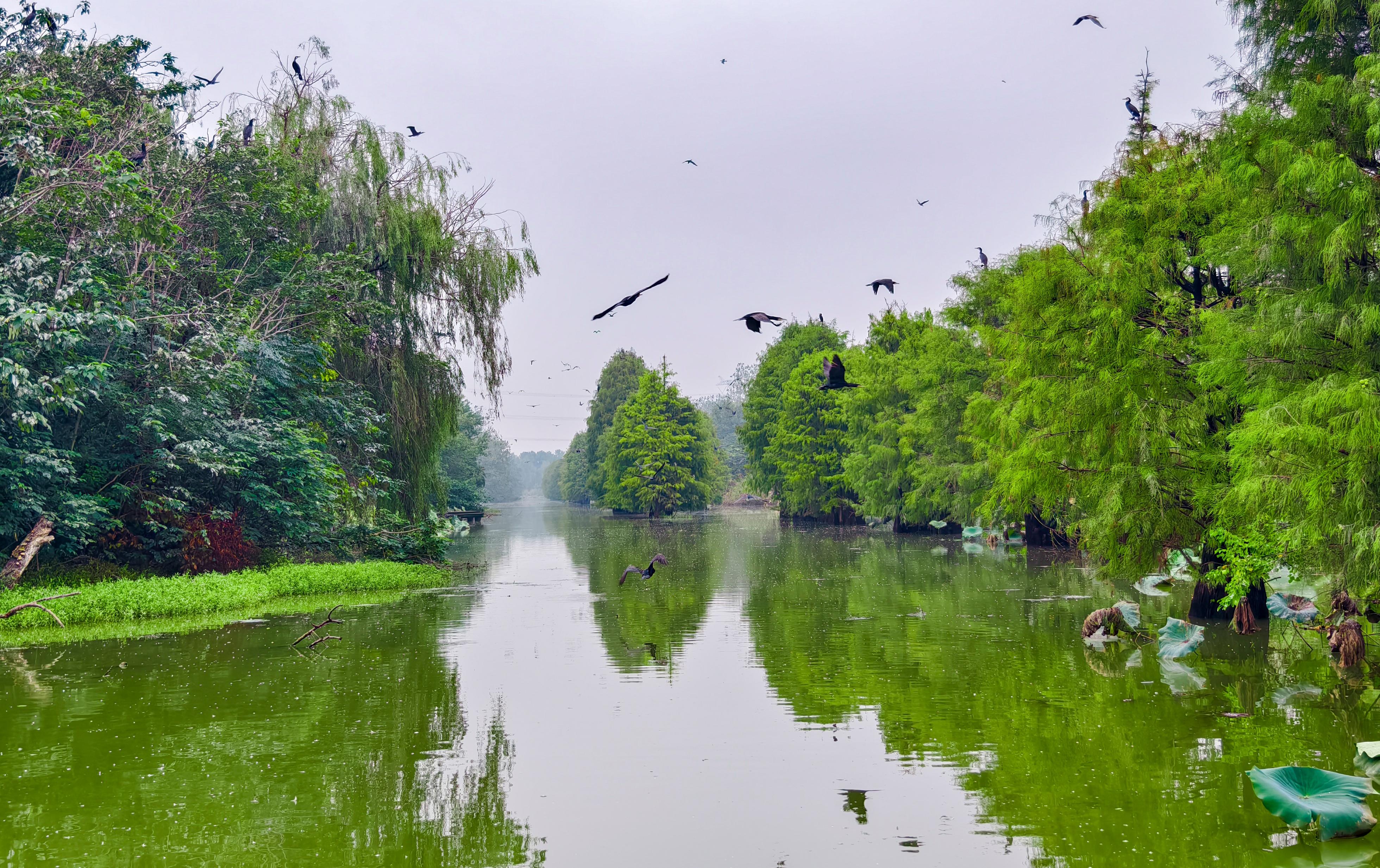 清晨,百鸟争鸣,婉转悦耳;黄昏,夕阳西下,群鸟归巢。乘船穿行朱湖湿地公园湖面,只见一群群鸬鹚或展翅高飞,或栖息树间,或觅食嬉戏,不禁感慨:好一个鸟类天堂!