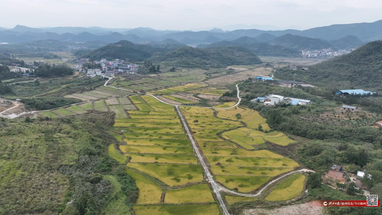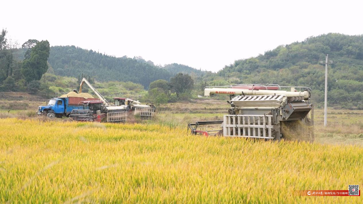 在宜章县梅田镇麻田村,连片的稻田里稻穗饱满低垂,从空中俯瞰,纵横交错的稻田一片金黄。在机器轰鸣声中,多台联合收割机沿着田垄有序作业,切割脱粒、秸秆粉碎、装车运输,整个过程一气呵成,短短几分钟就完成了一丘稻田的收割。