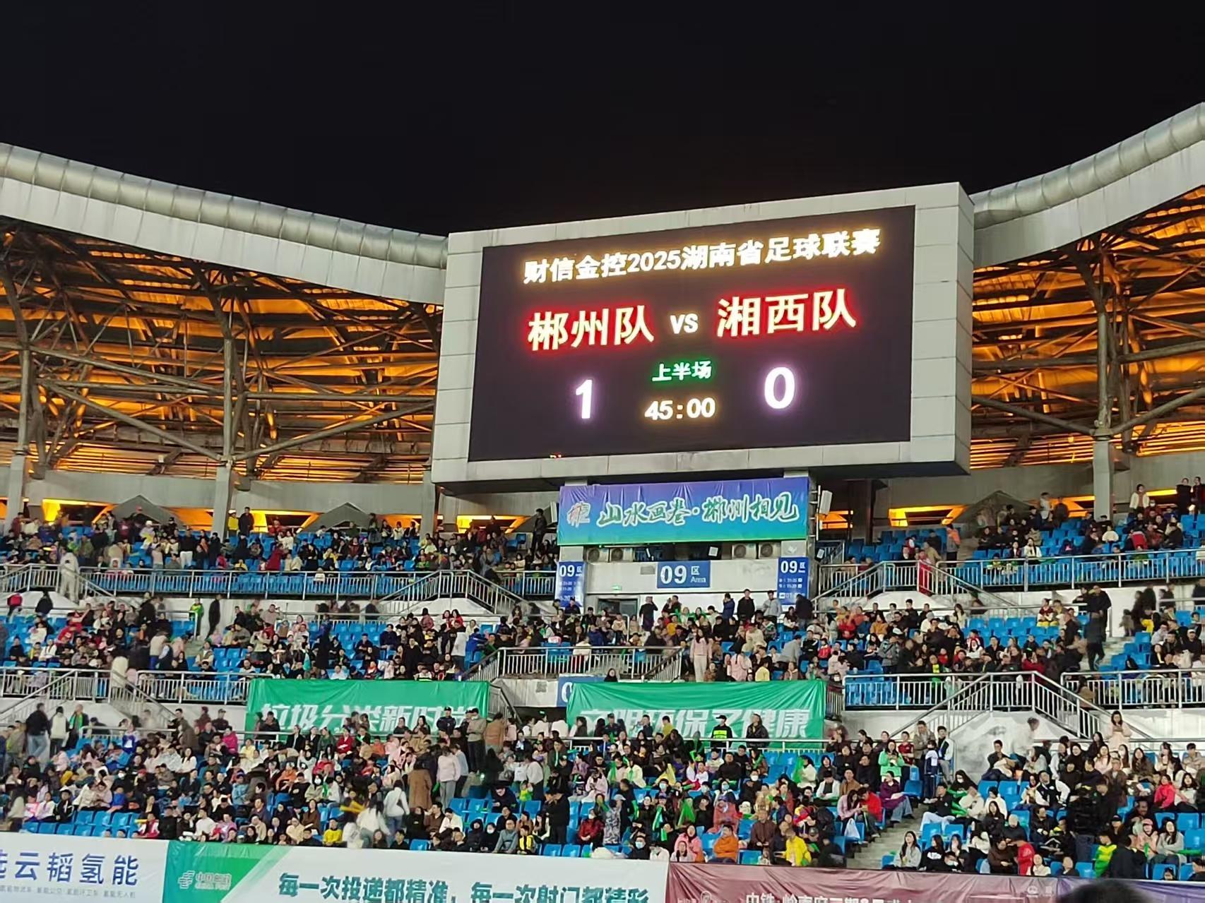 刚刚,“湘超”上半场结束,郴州队1:0领先湘西队。