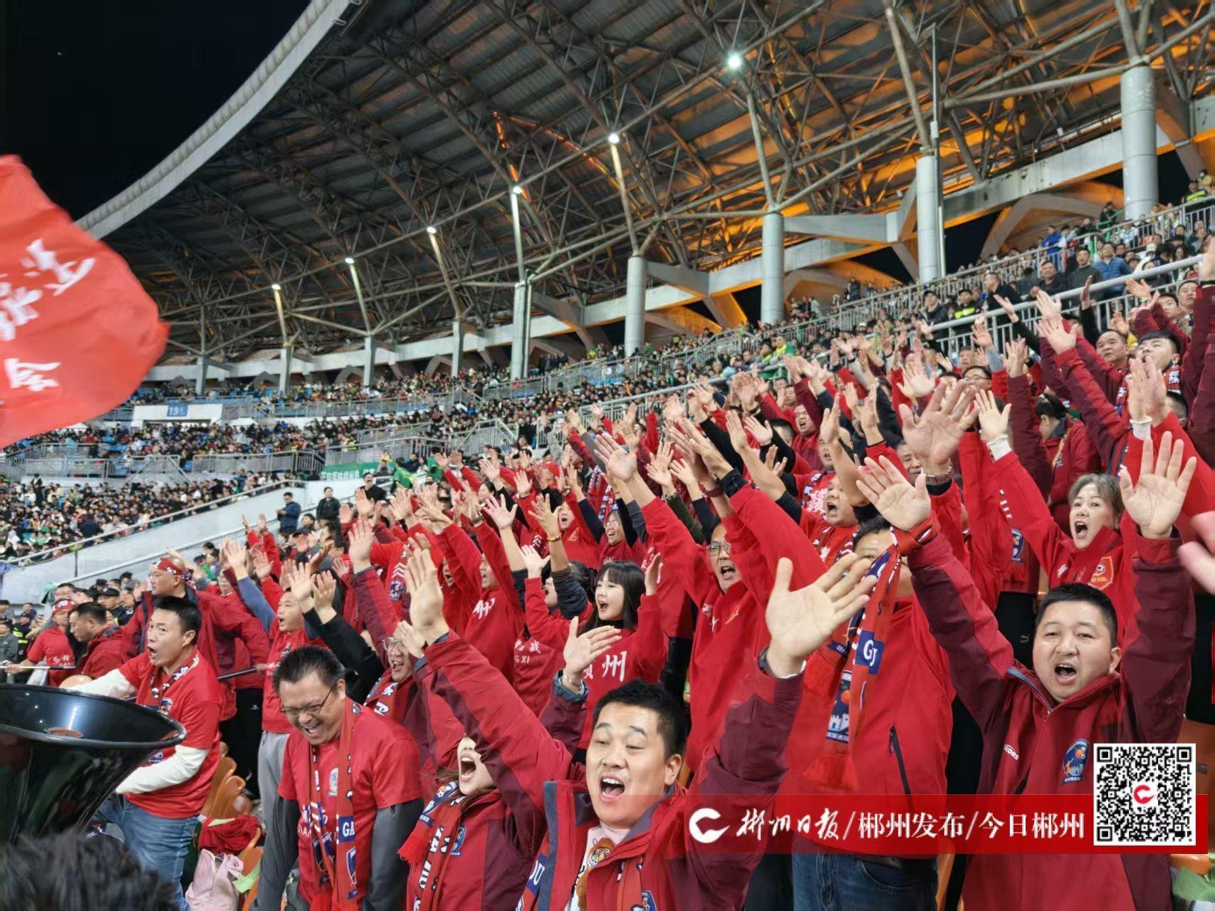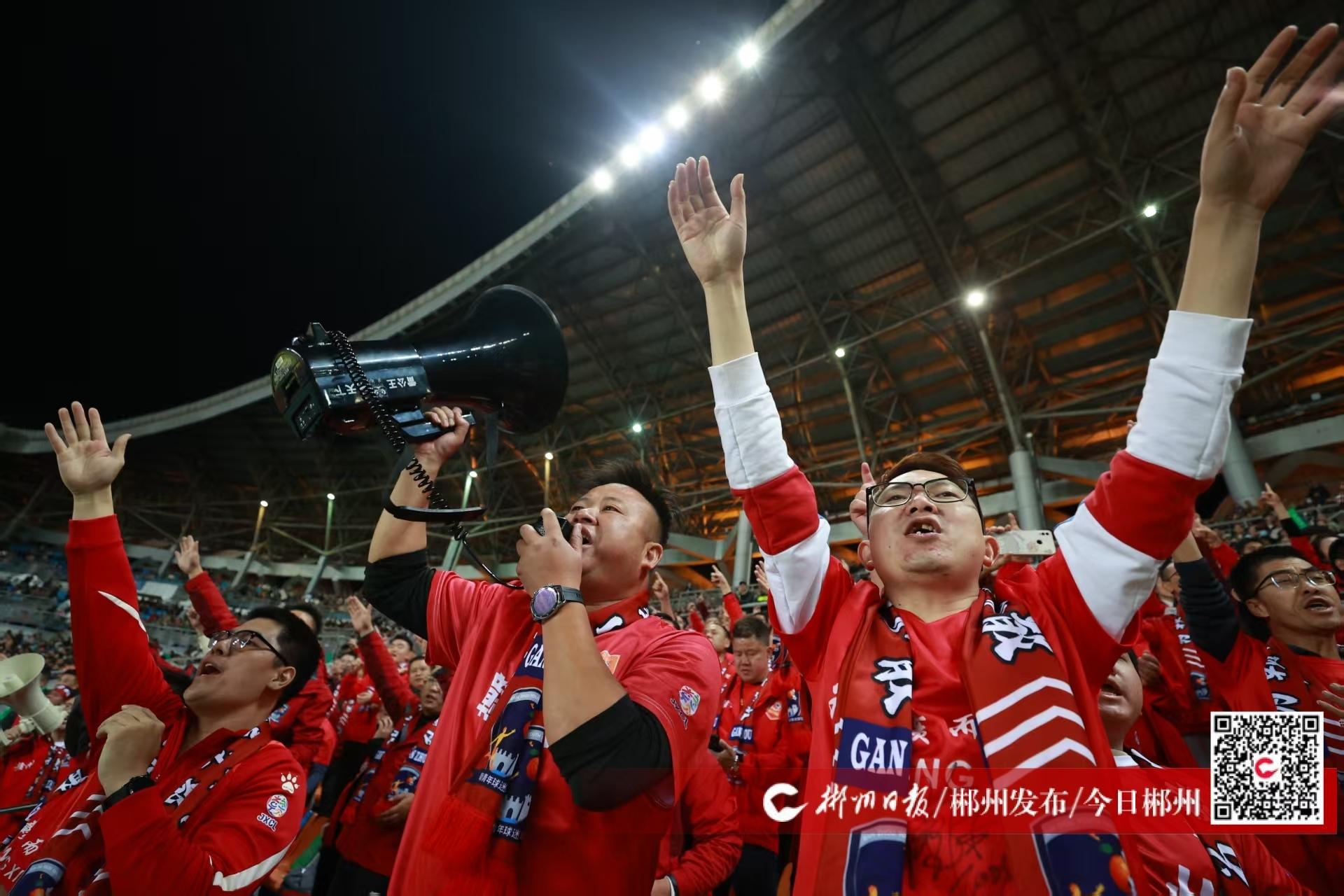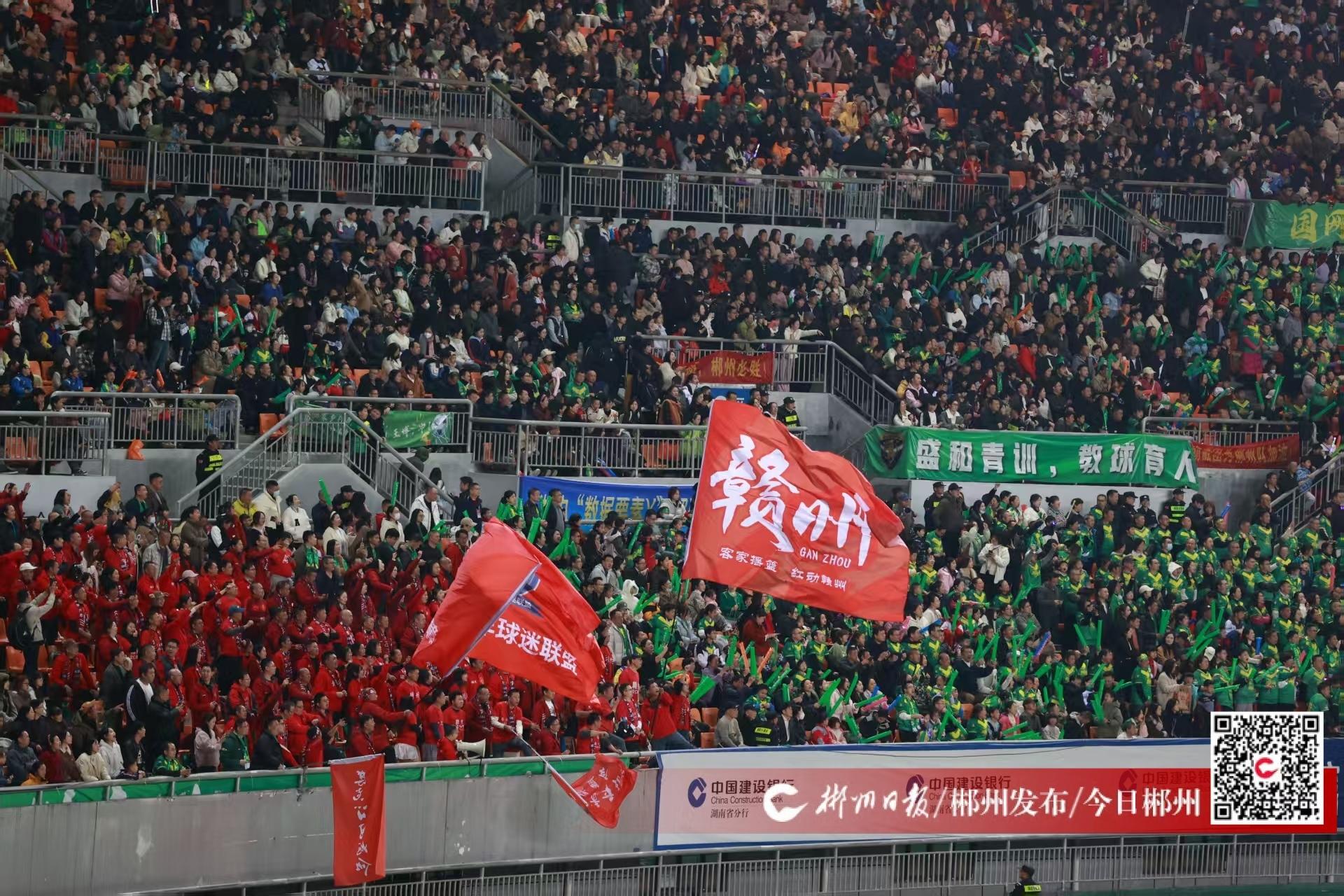 “郴州加油!” 21日晚,比赛现场,助威声不绝于耳。150余名赣州球迷与郴州本土球迷并肩而战,他们放下地域的距离,以同样的热忱为郴州队呐喊,每一声助威都饱含着“老表同心”的情谊,为郴州队注入了满满的能量。