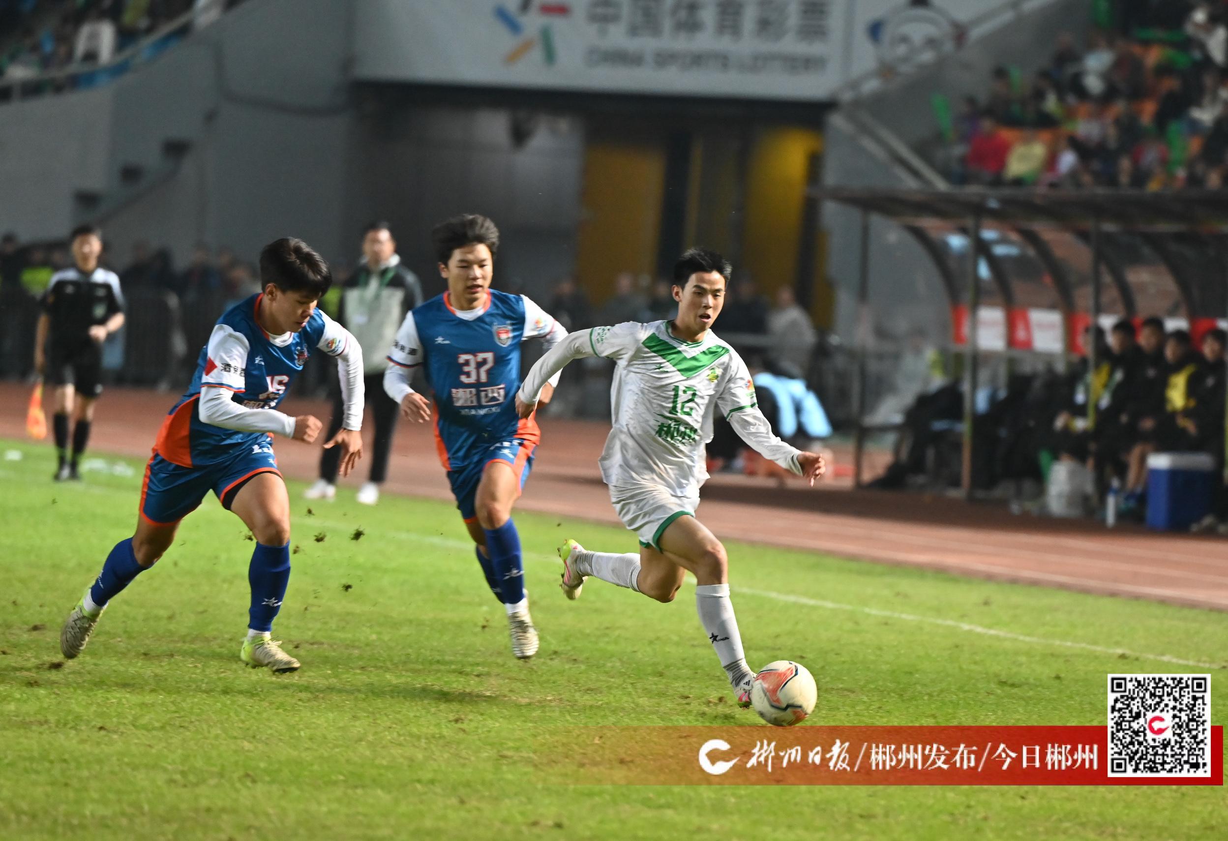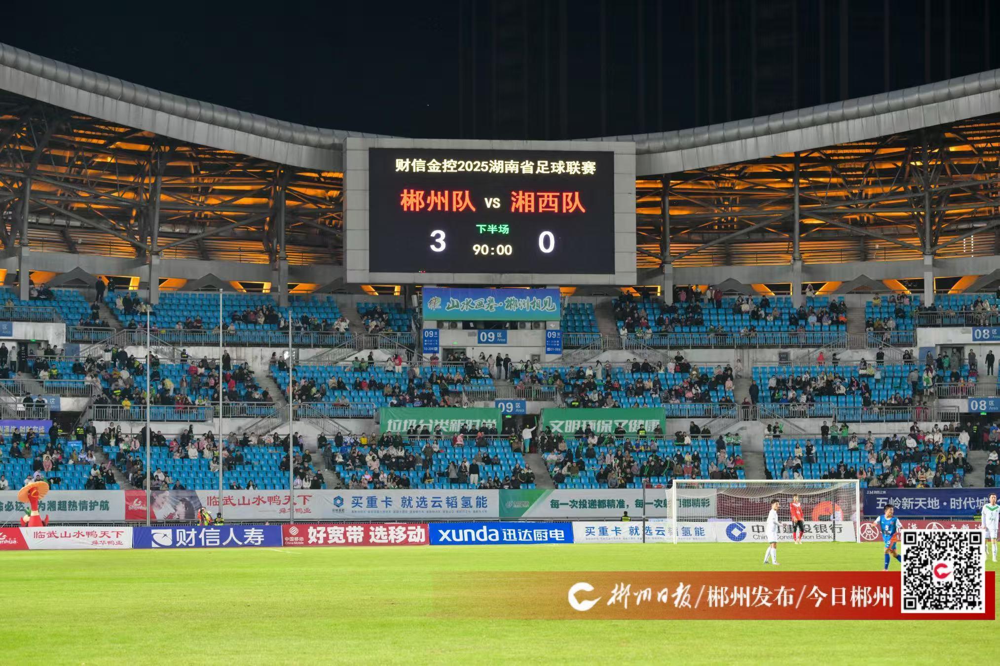 11月21日晚,“湘超”联赛第十一轮展开角逐,郴州队主场迎战湘西队。经过90分钟鏖战,郴州队以3:0战胜对手,在主场球迷的助威声中全取三分。