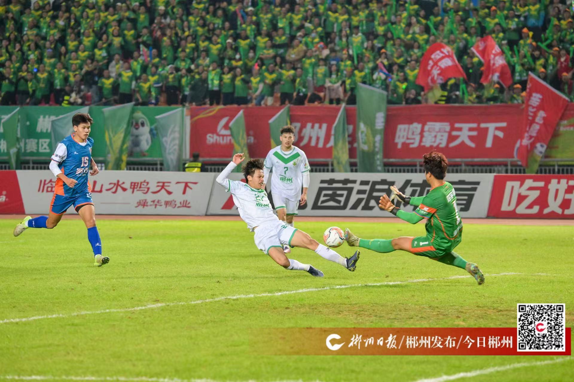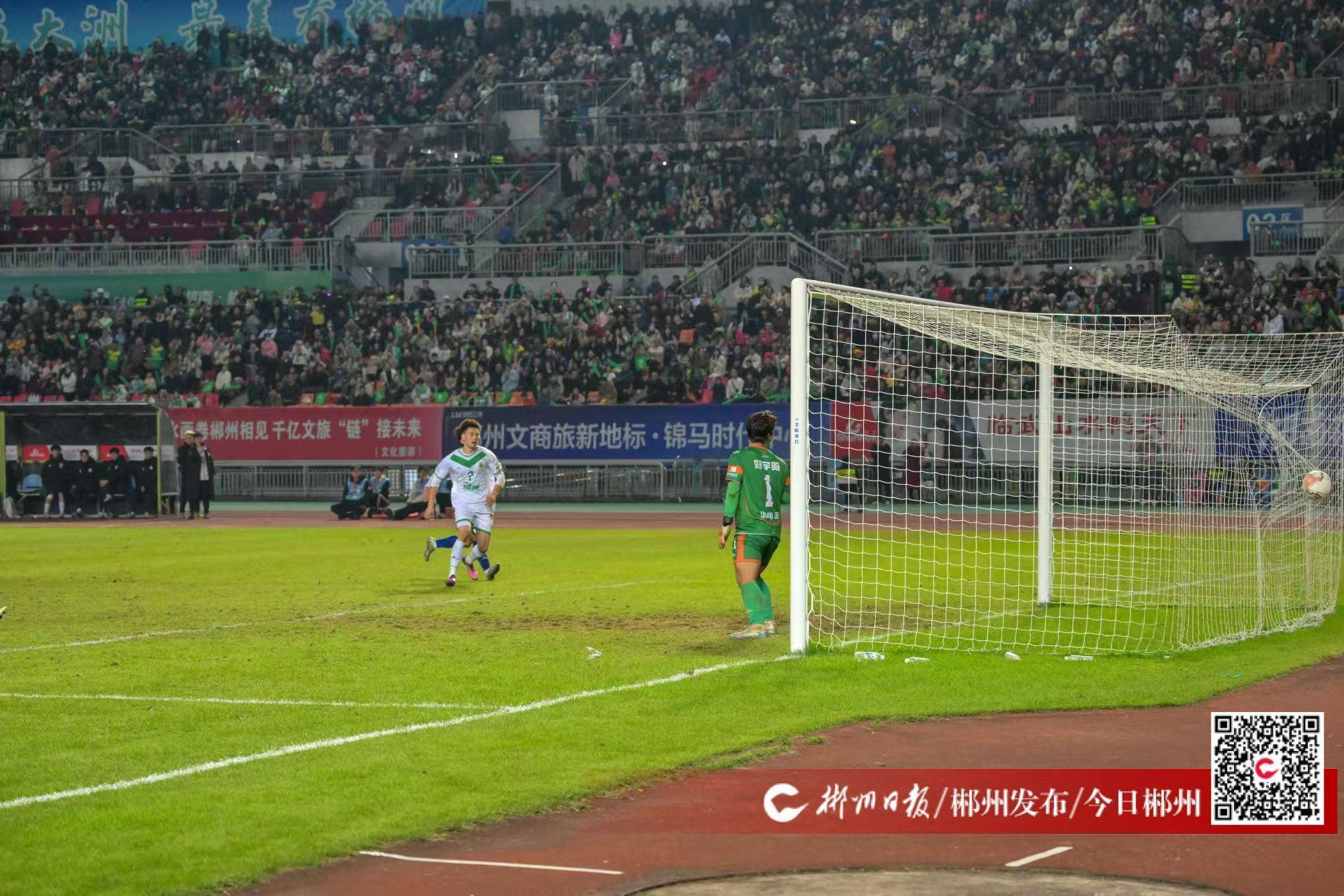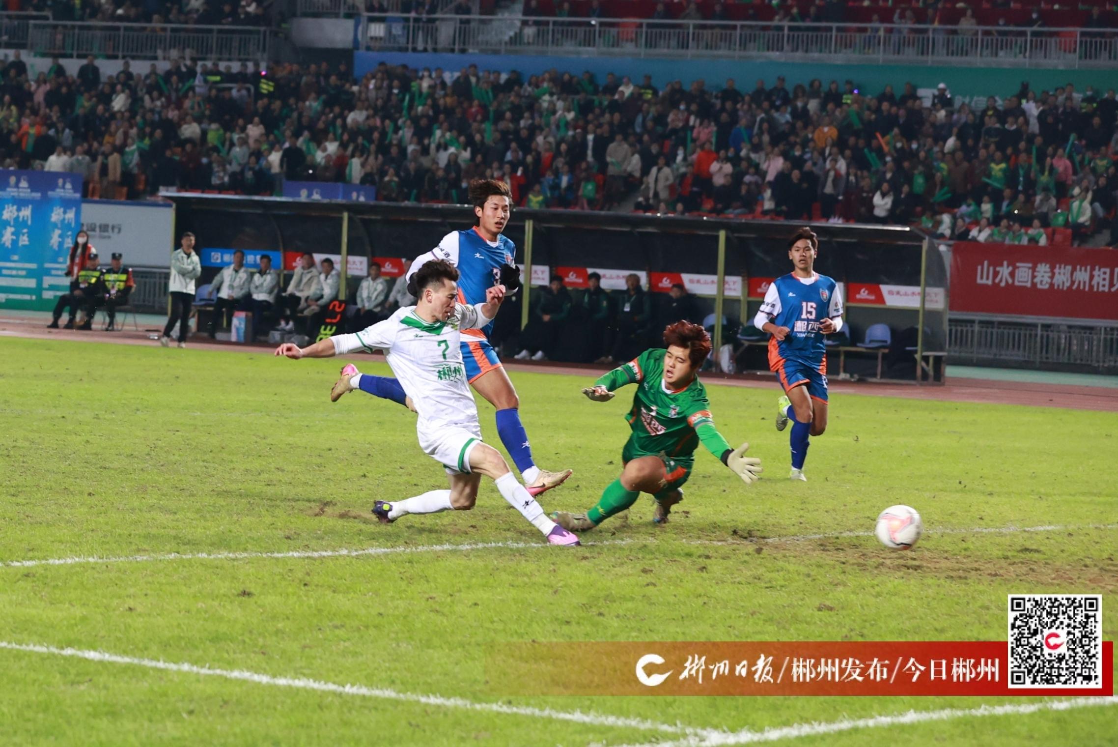 比赛第16分钟,郴州队打破僵局。一次右侧角球开出后,禁区内发生混战,6号球员鲍锦荣敏锐捕捉到第二落点,迎球一脚推射入网,帮助郴州队取得1:0领先。