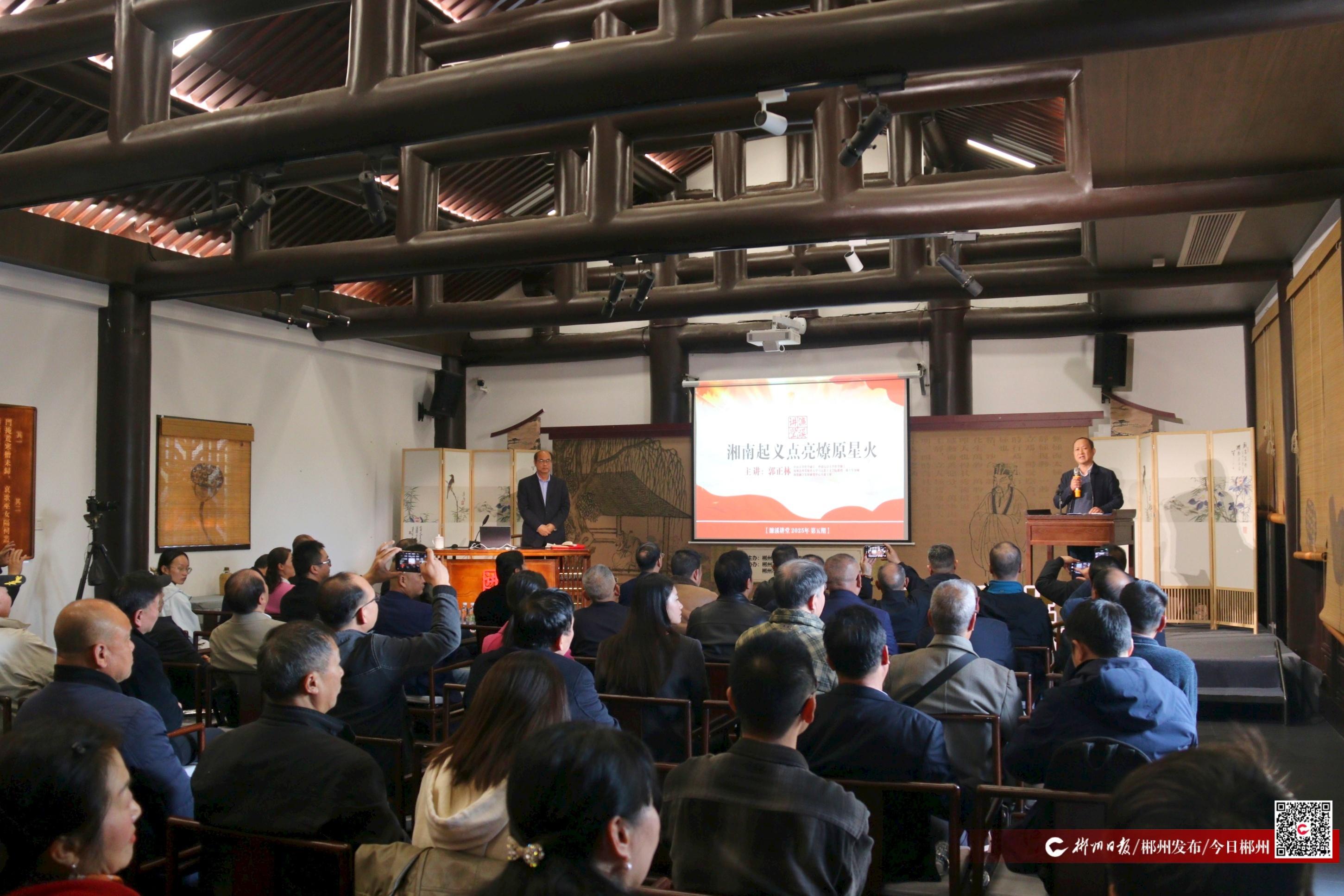 郭正林以《湘南起义点亮燎原星火》为题,带领现场观众重温了湘南起义那段烽火岁月。他深刻阐述了这场起义如何为中国革命积蓄并输送了磅礴的军事与人才力量,铸就了不可磨灭的历史功勋,提出要深植红色根脉以传承历久弥新的精神火炬,锚定发展坐标让红色动能为现代化实践赋能,从而凝聚担当力量,奋力书写新时代强国建设的新篇章。