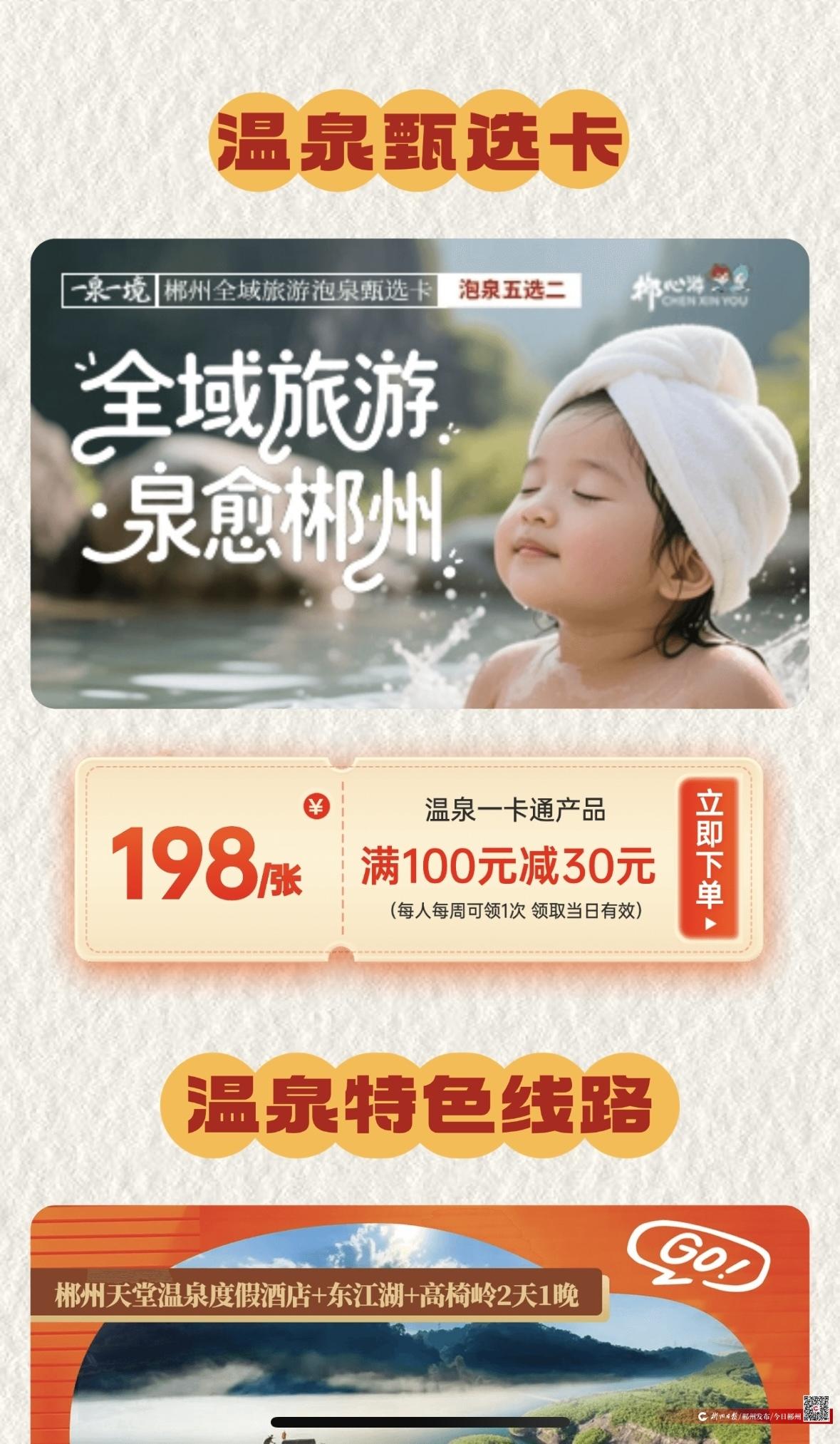 11月24日,记者从“潮起潇湘 相约湖南”2025湖南文旅冬季温泉消费季暨“十泉十美”郴州珍稀温泉康养季活动现场获悉,2025年11月24日至2026年3月3日,郴州将推出总额30万元的温泉消费券,通过“郴心游”小程序每周发放。