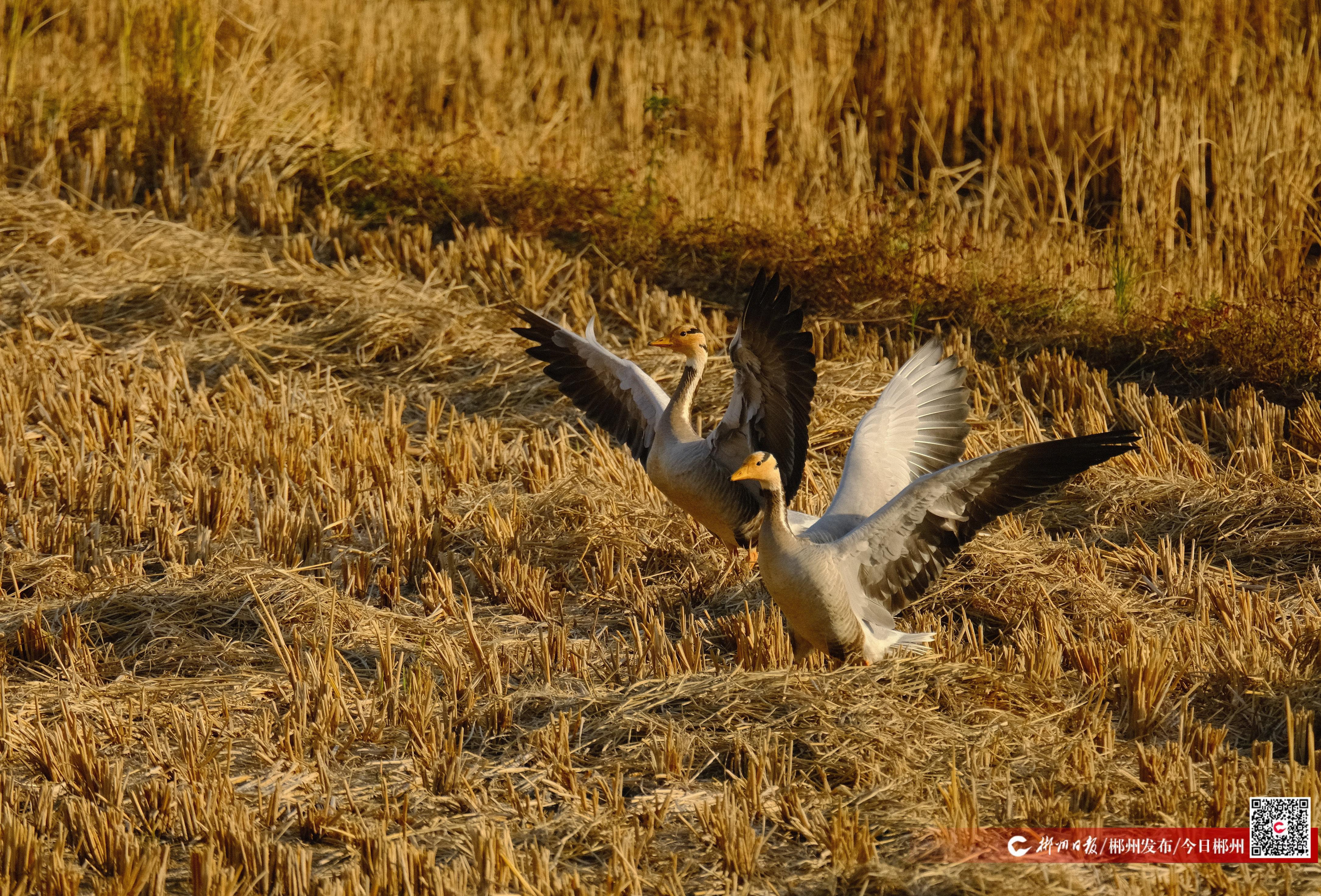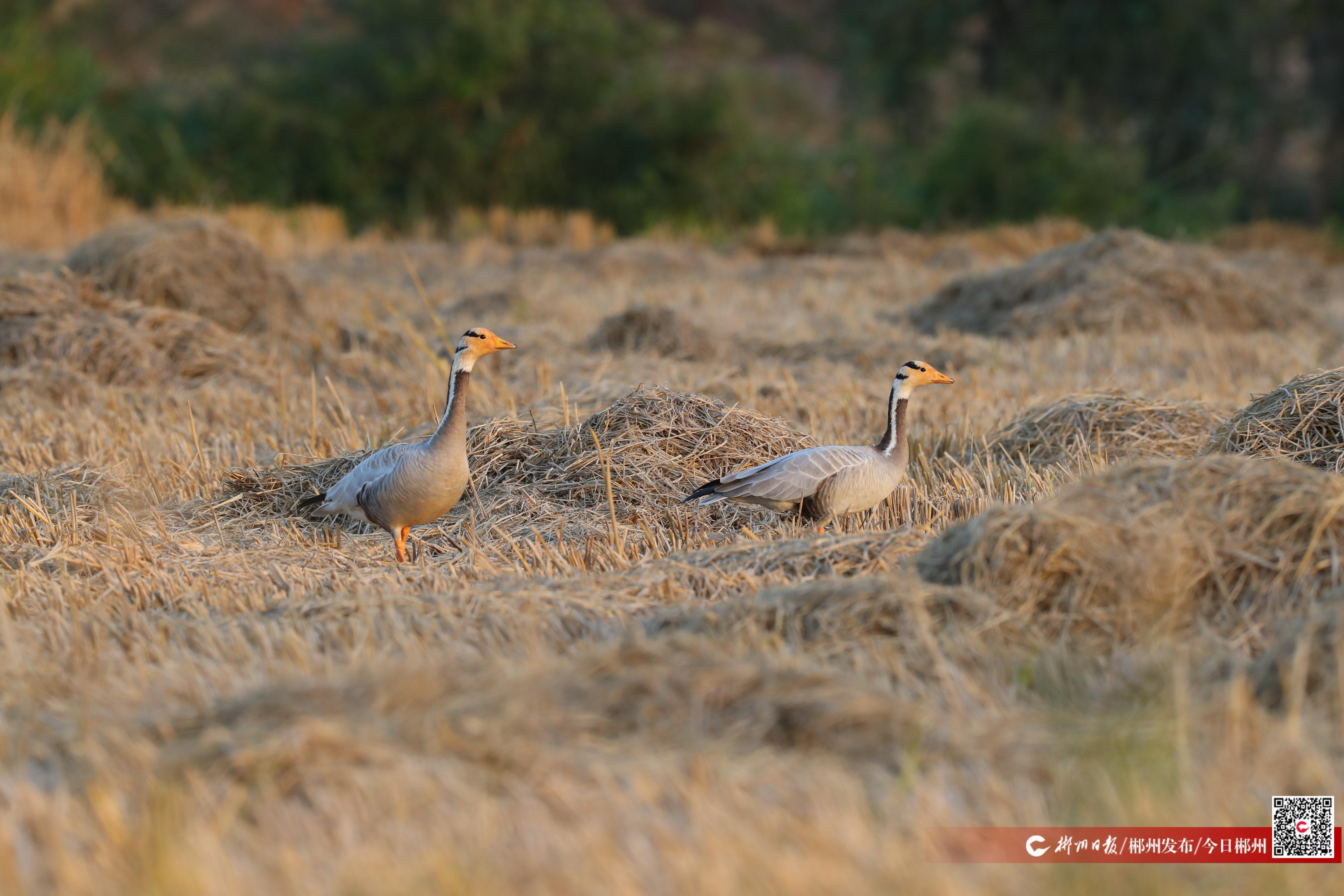 11月27日,在舂陵国家湿地公园洋市段江边稻田,这两只斑头雁正悠然啄食禾苗根茎,姿态优雅。其独特的形态特征——头部洁白,头顶至后颈点缀两道清晰的黑色横斑,橙黄色的喙和脚在阳光下格外醒目,让工作人员一眼就确认了这一珍稀物种的身份。