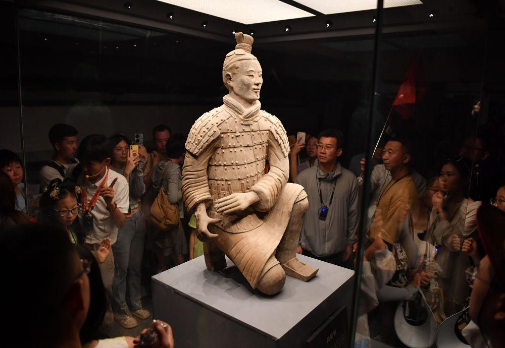 2024年5月17日,游客在陕西秦兵马俑二号坑遗址参观跪射俑。秦始皇陵和兵马俑坑考古发掘至今已逾半个世纪,成为世界认识中华文明的名片。