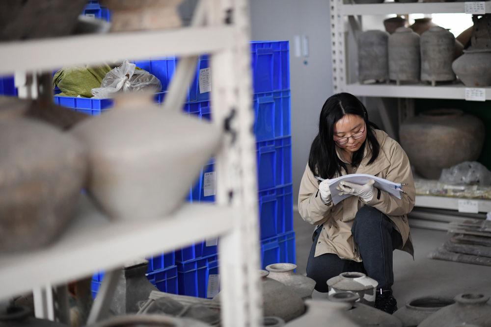 2024年3月5日,陕西省考古研究院女子考古队队员张佳杨在文物库房登记文物信息。成立于2020年的女子考古队先后完成包括蒋刘仰韶晚期环壕聚落、大堡子西汉陵邑墓地等重要发现在内的基本建设考古项目数十项。