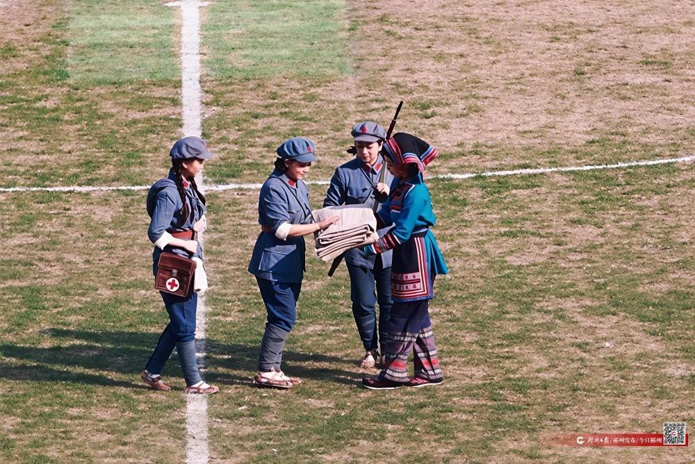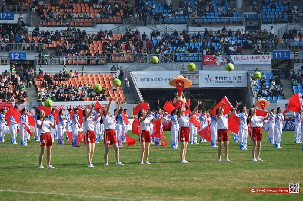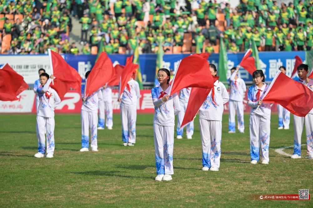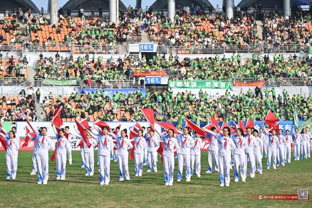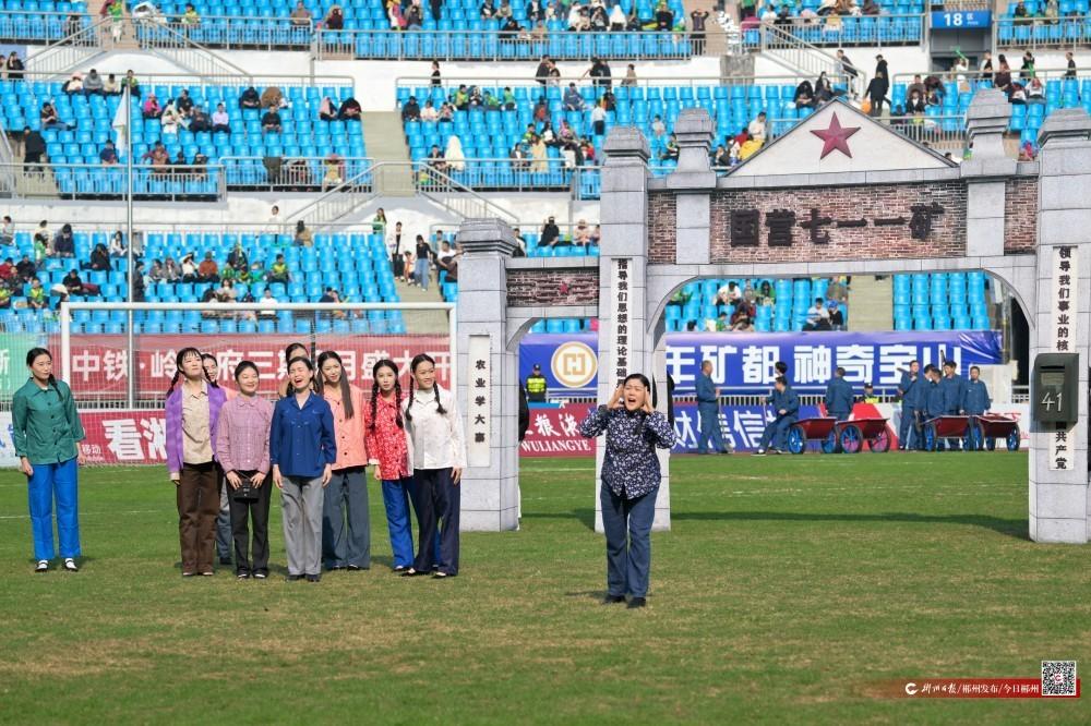 当情景剧的余韵仍在空气中回荡,情景舞蹈《五星红旗》以更加磅礴的气势点燃了全场。来自湖南省昆剧团的专业演员与郴州北湖区明星学校的师生共125位表演者,以整齐划一的铿锵舞步、昂扬向上的奋进姿态,展开了一场跨越时空的精神对话。中国女排的坚韧、“两弹一星”的自主攻坚、红军长征的百折不挠,与足球场上“无畏挑战、全力争胜”的意志深深共鸣,在舞台上汇聚成一股奔腾向前的力量洪流。舞者的每一次跃起与舒展,都如绿茵场上的冲刺与拼抢,激荡起球员与球迷心中的火焰,也让“敢为人先、奋勇争先”的郴州精神随着节奏澎湃激荡。
