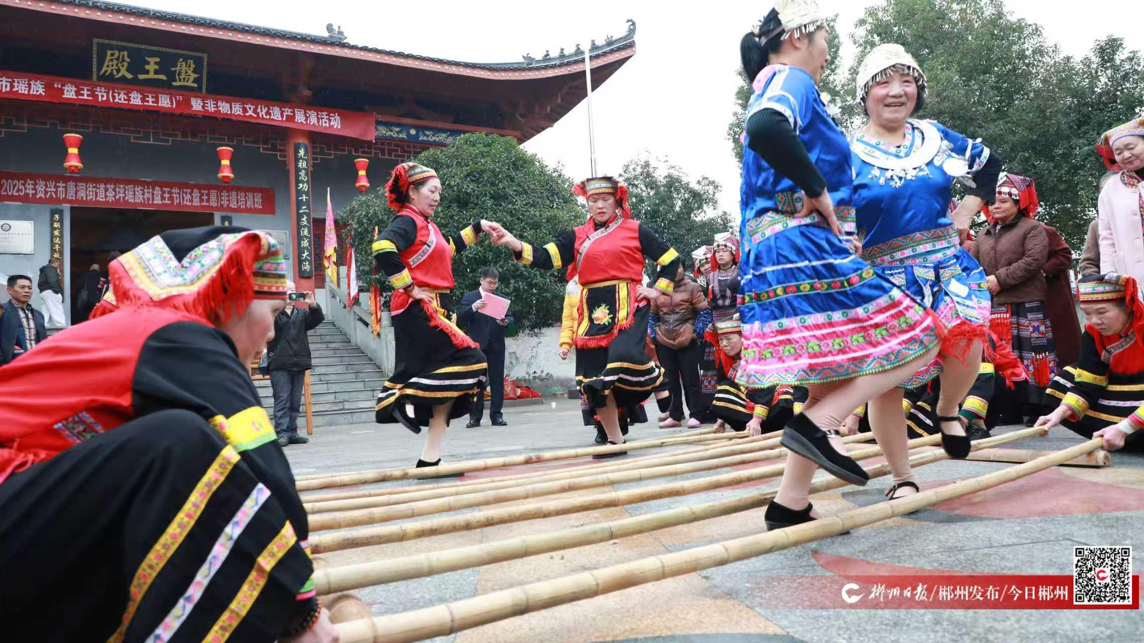 一年一度的瑶族“盘王节(还盘王愿)”是传承瑶族文化与瑶族礼仪的重要活动,迄今已有1700多年历史,集瑶族传统文化之精华,也是增强民族向心力、维系民族团结的人文盛典。活动现场,茶坪瑶族村籍国家级非遗代表性传承人赵光舜带领他的“师公”团队现场演示了“招五谷魂”“还园箕愿”“修愁解意”等祭祖祈愿礼仪,村级文艺宣传队展演了瑶族长鼓舞、瑶歌对唱、瑶家武术、舞龙舞狮、竹竿舞等丰富多彩的民俗活动,原汁原味展现了资兴瑶族文化精髓,为现场观众带来了一场视觉盛宴。