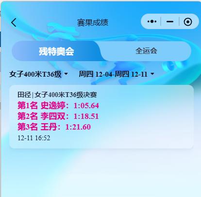 12月11日,在刚刚结束的全国第十二届残疾人运动会暨第九届特殊奥林匹克运动会女子400米T36级决赛中,郴州籍运动员史逸婷以1分05秒64的优异成绩强势夺冠。