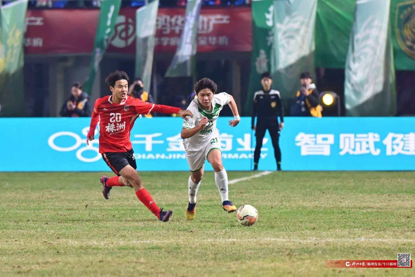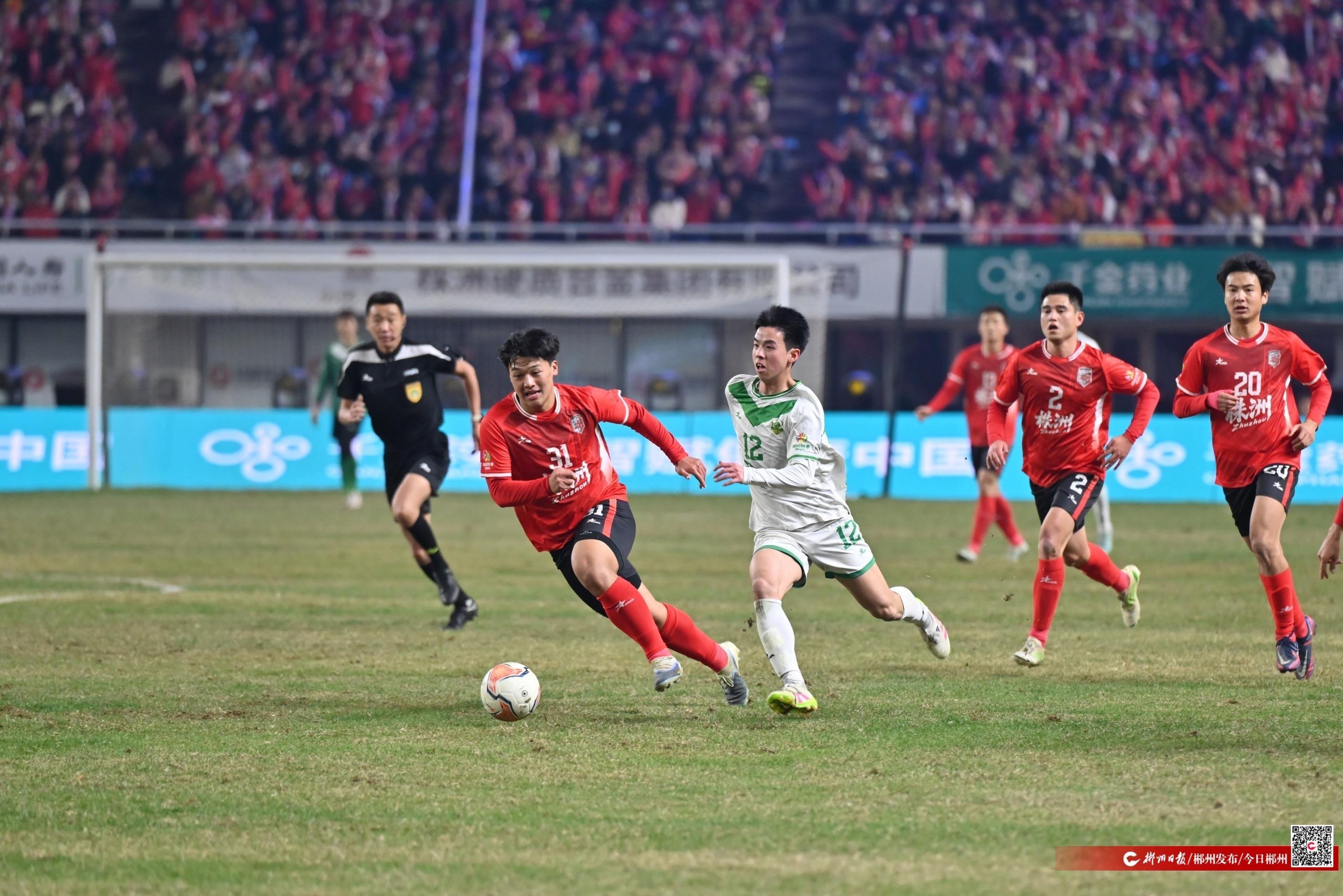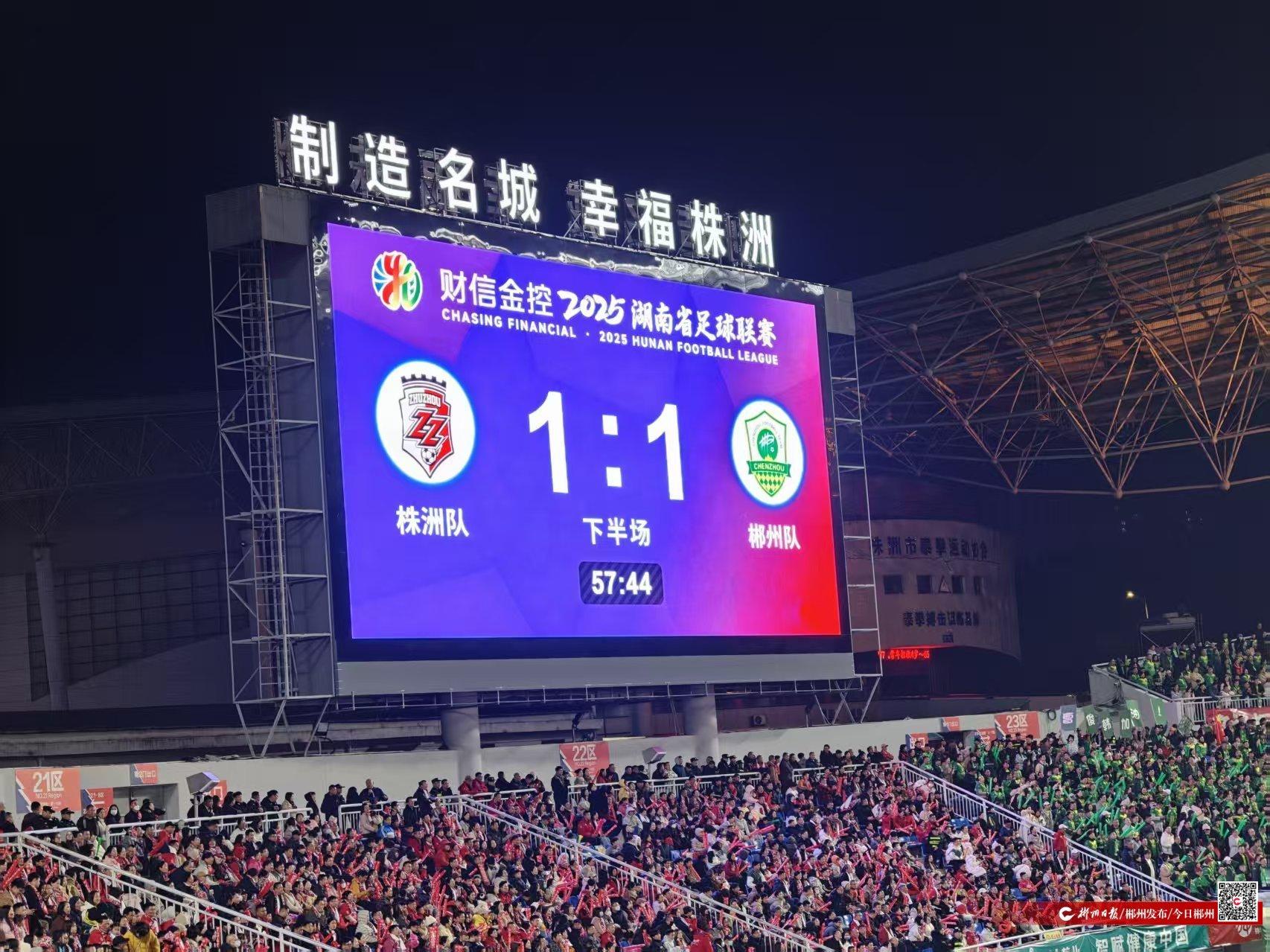 12月14日晚,“湘超”联赛1/4决赛,郴州队客场对战株洲队,刚刚,比赛进行到57分钟,郴州队进球了,双方1:1战平。