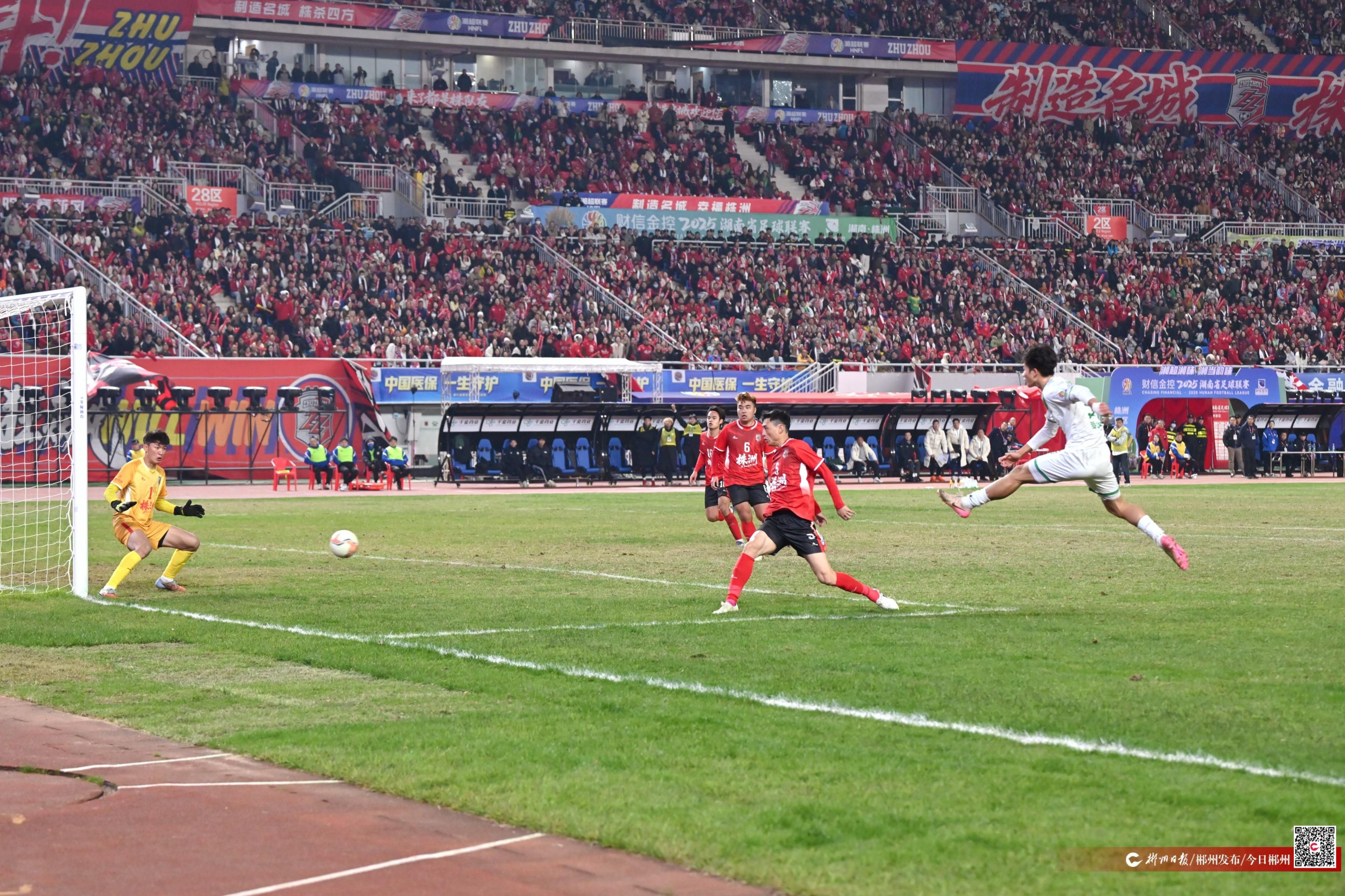 12月14日晚,“湘超”联赛1/4决赛打响,郴州队客场对阵株洲队。经过90分钟角逐,郴州队与株洲队1:1战平。最终,株洲队在点球大战中,以7:6战胜郴州队,成功闯进四强。