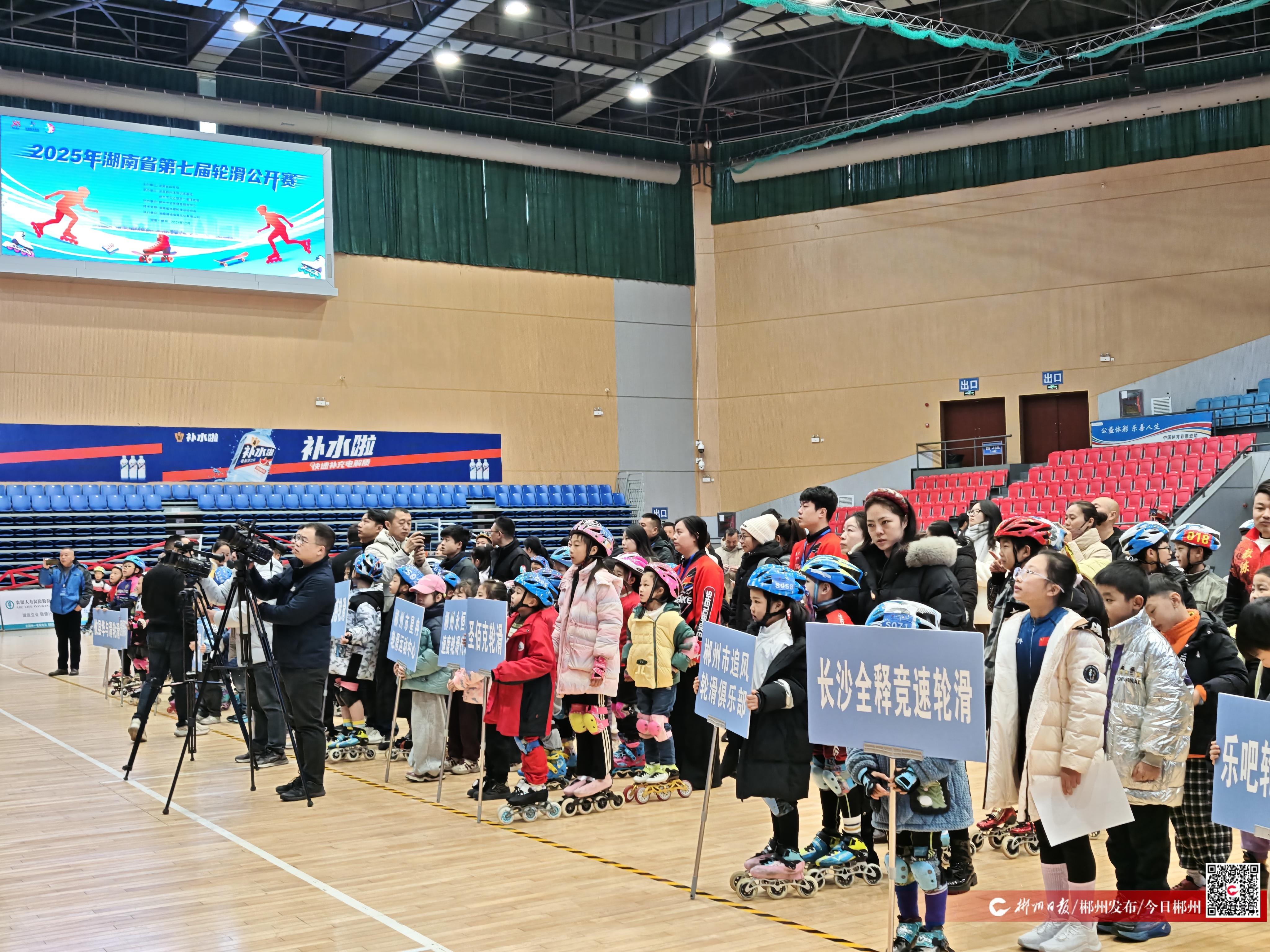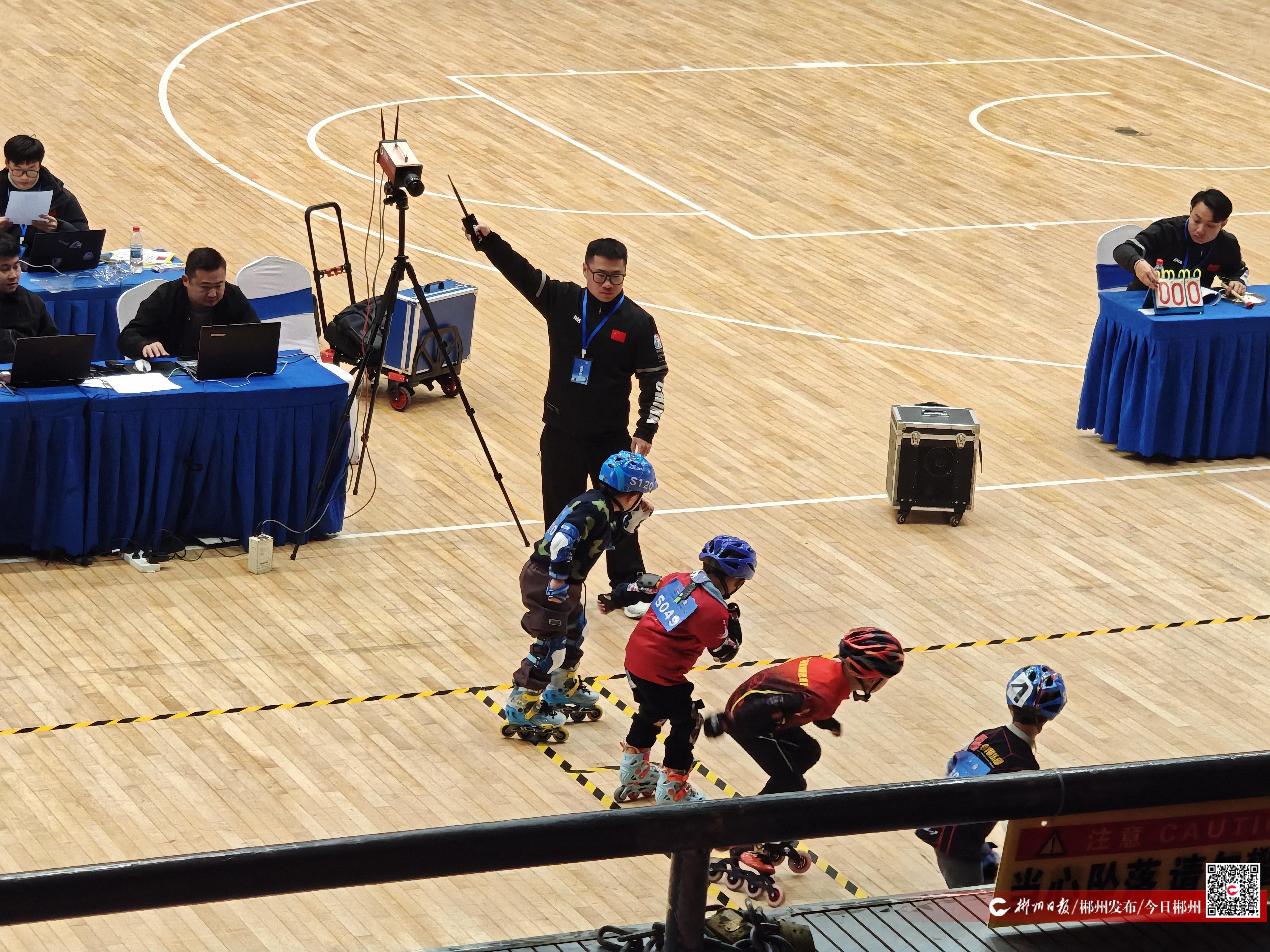 12月14日,2025年湖南省第七届轮滑公开赛在国家排球湖南郴州体育训练基地腾飞体育馆开赛,来自全省13个代表队的近200名轮滑爱好者齐聚郴州登场竞技。