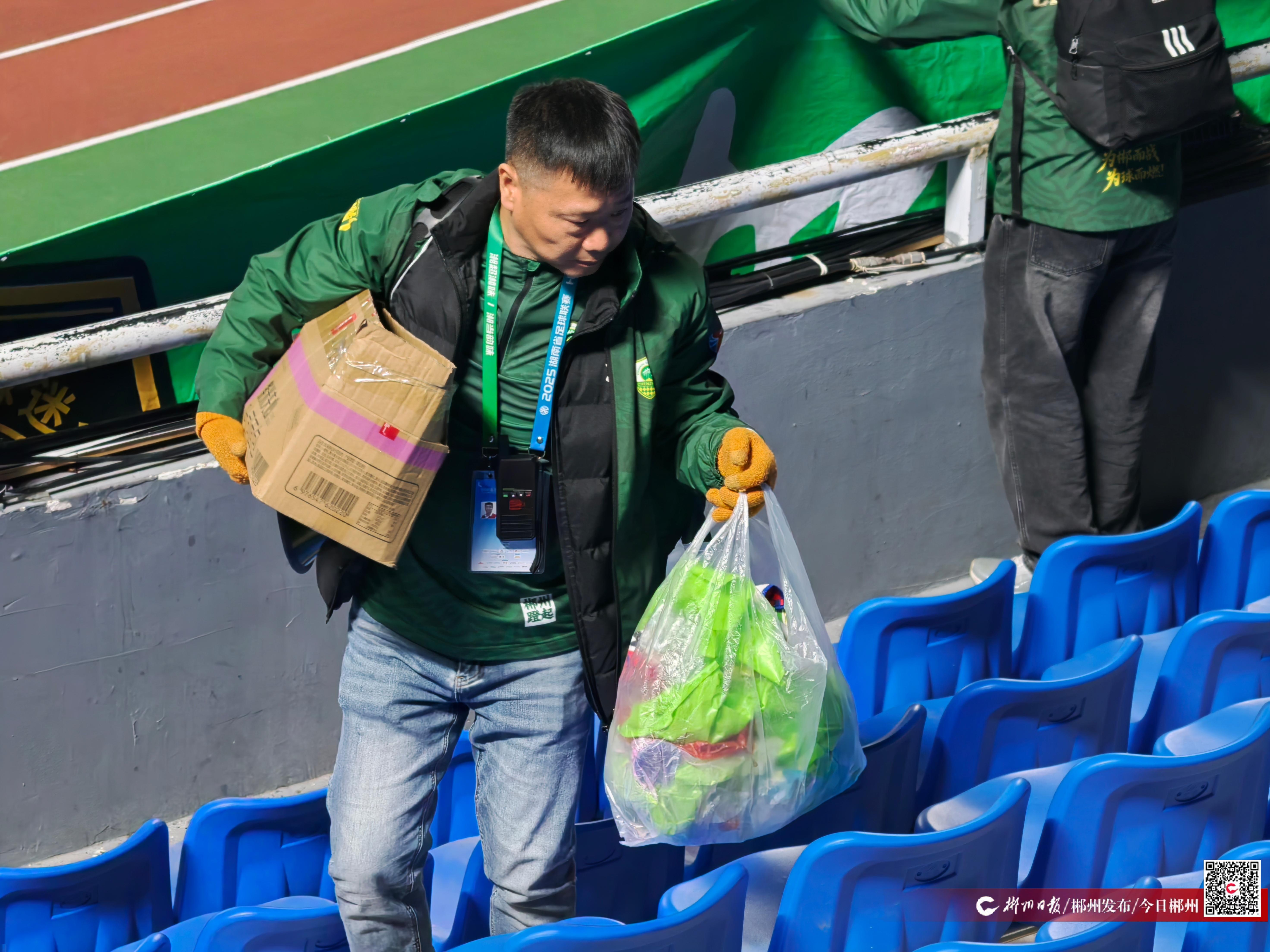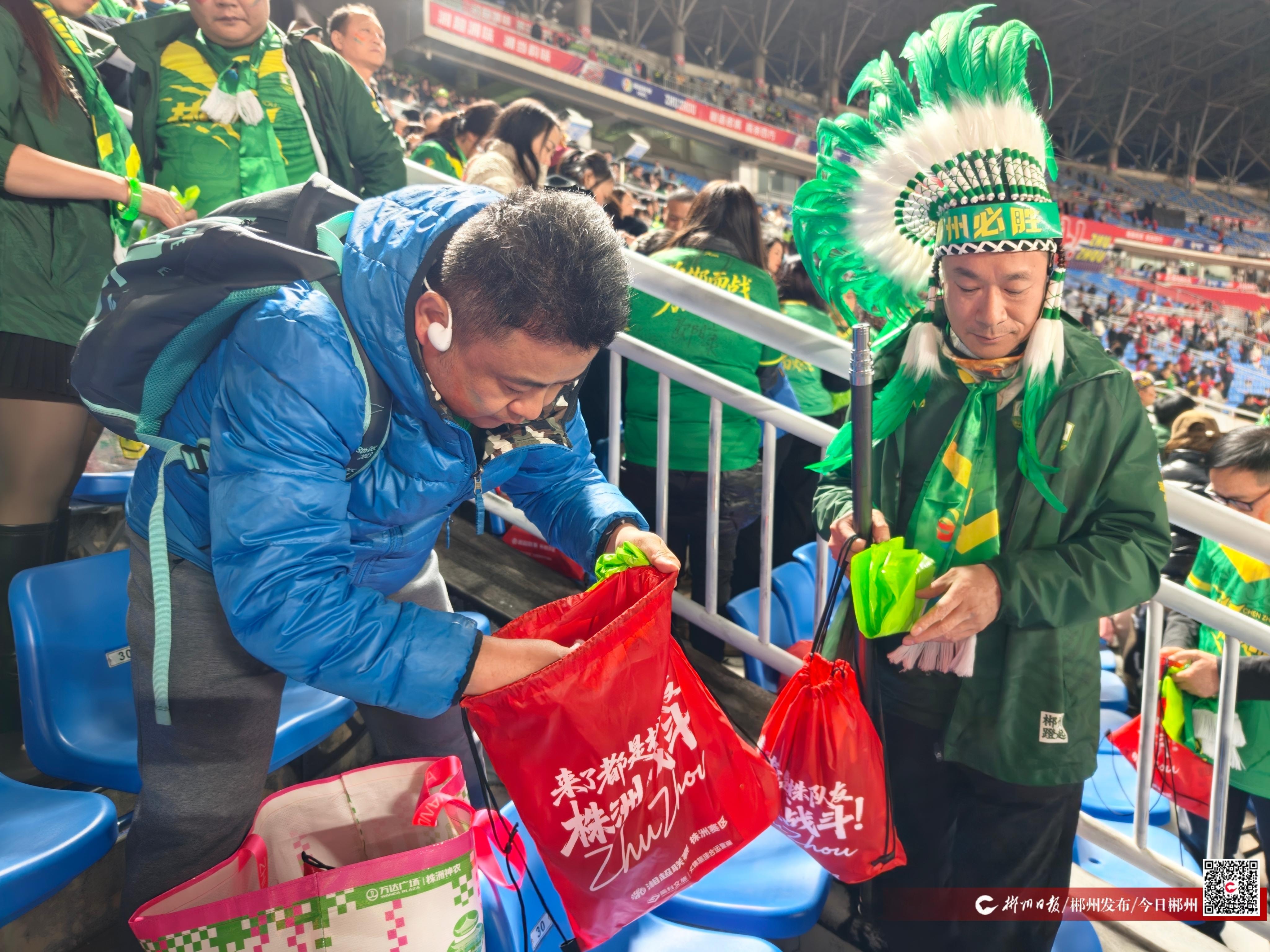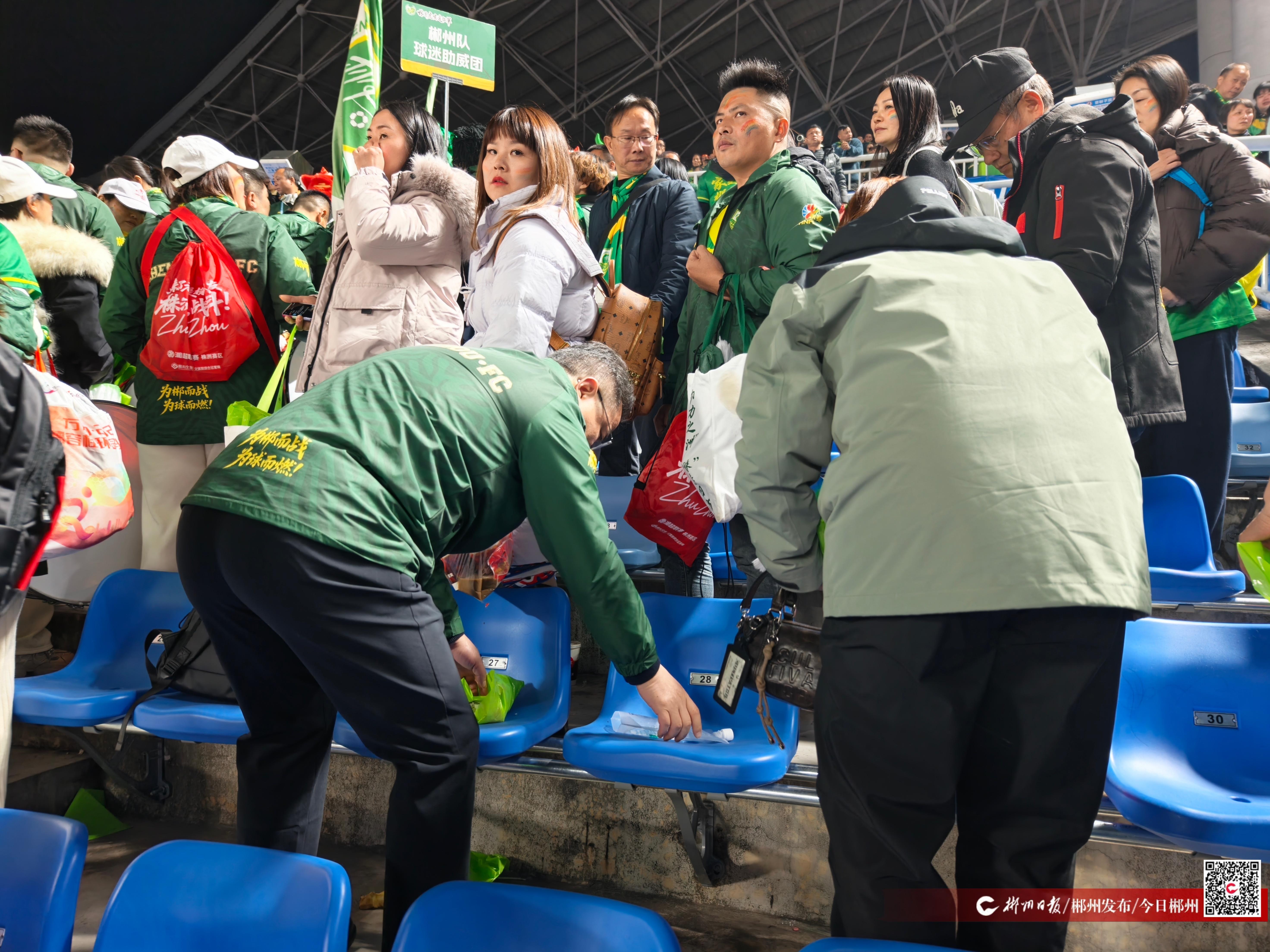 赛前,检票入口处早早排起了长队。身着绿色助威服的郴州球迷耐心等候,主动配合安检,秩序井然。没有推搡与喧哗,只有彼此间关于比赛的轻声讨论与热情问候。比赛中,球迷方阵助威声浪此起彼伏,口号整齐响亮。激情之余,文明细节随处可见:不少球迷随身携带了环保袋或小垃圾袋,将食品包装、水瓶等杂物妥善收起;欢呼与叹息间,无人向场内投掷物品,始终将热情约束在安全、文明的边界内。