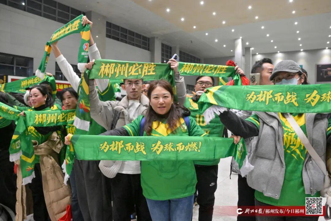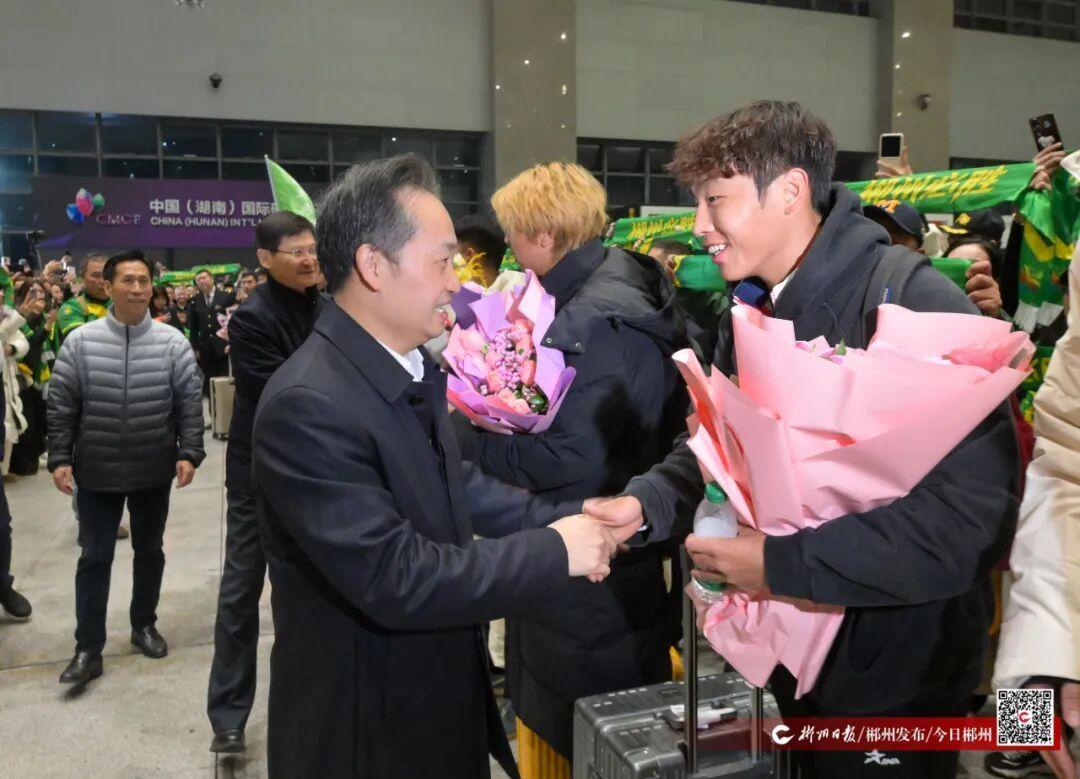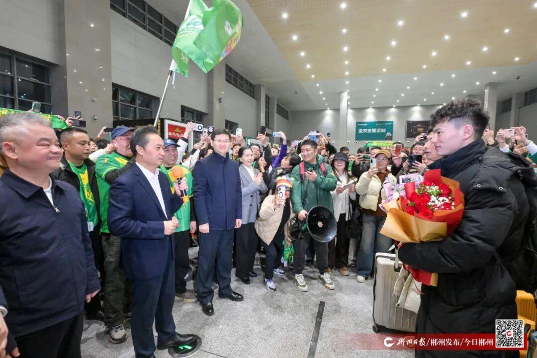 12月15日00:18,“湘超”郴州队球员及球迷搭乘高铁抵达郴州,市委书记吴巨培,市委副书记、市长阚保勇现场迎接。