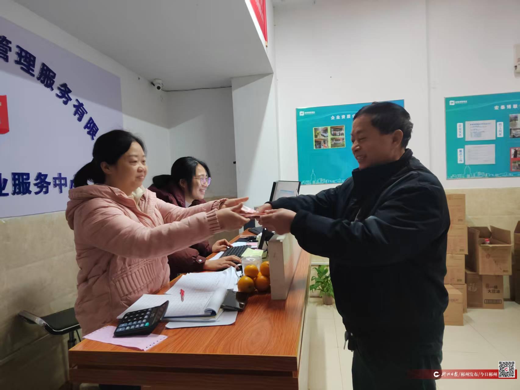 12月14日下午,在苏仙区卜里坪街道环城桥社区苏仙御景湾小区,业主雷老四正在预缴2026年度物业费。物业服务工作人员一番计算后告诉他,他家2025年度的分红为238.7元。