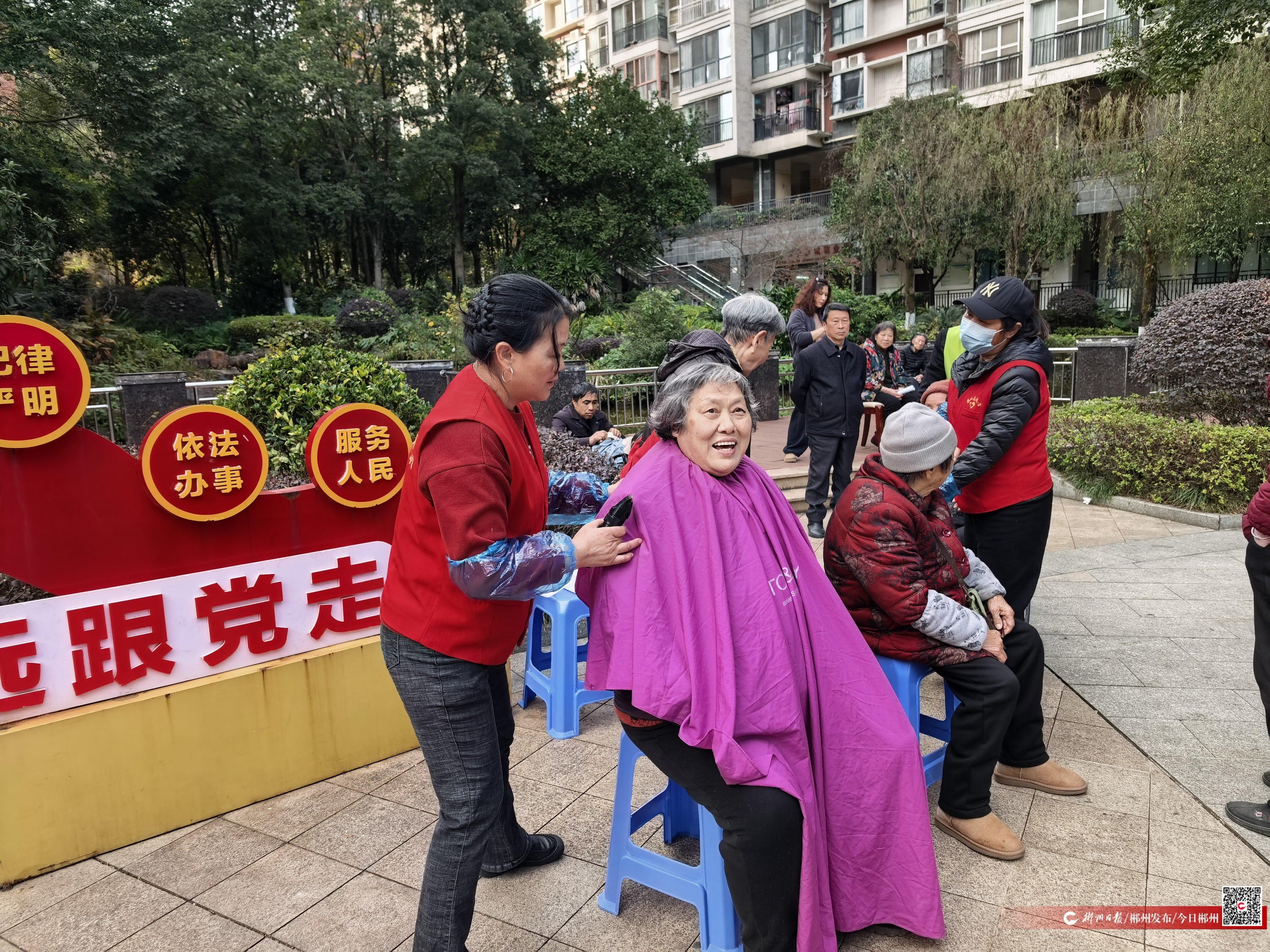 量血压、剪头发、洗鞋子……12月15日下午,苏仙区白鹿洞街道的樟树岭社区里暖意融融。一场“便民服务进社区 义诊义剪暖人心”志愿服务活动在这里举行。活动现场,志愿服务摊位有序排开,吸引了众多居民驻足参与。