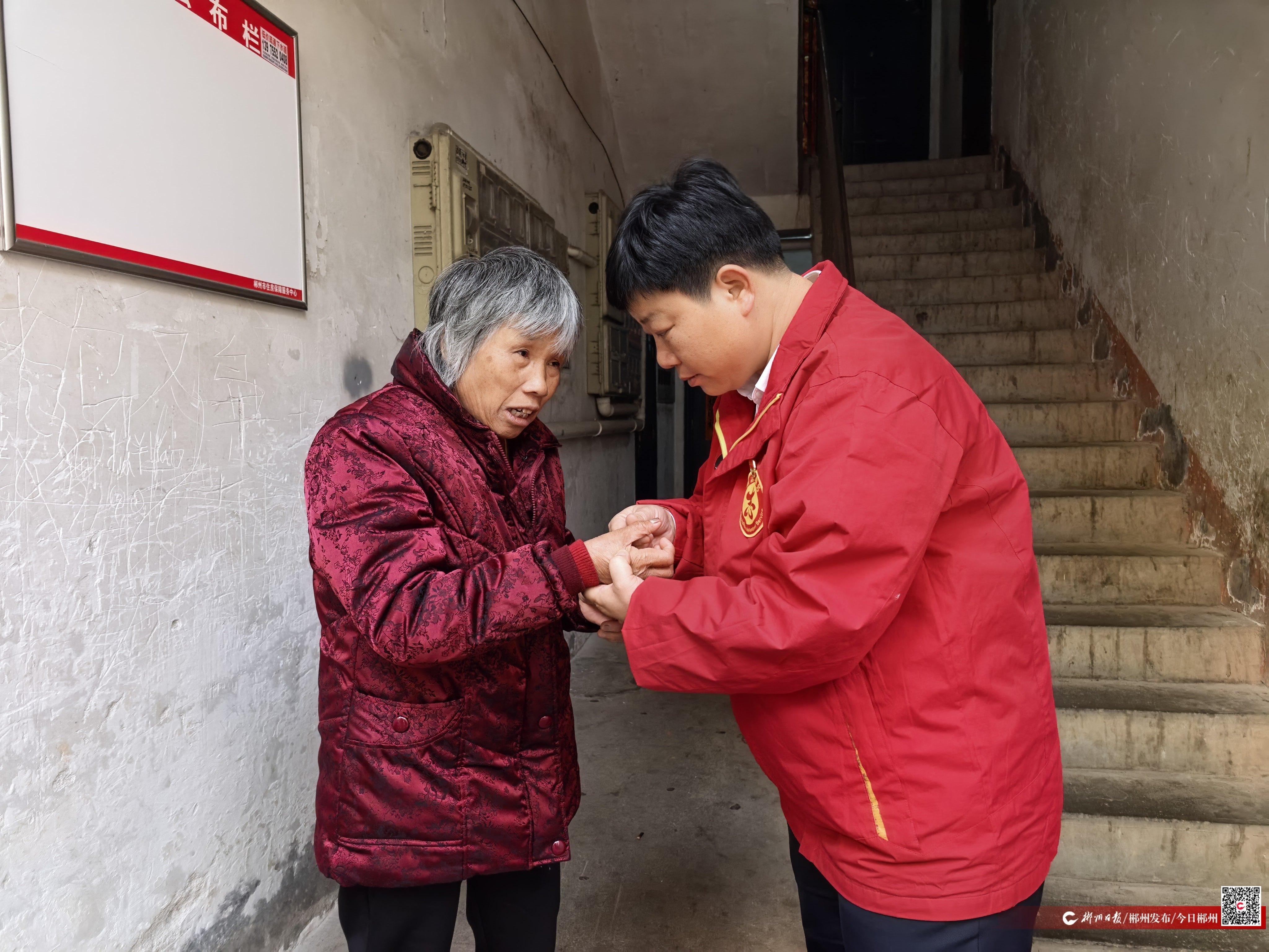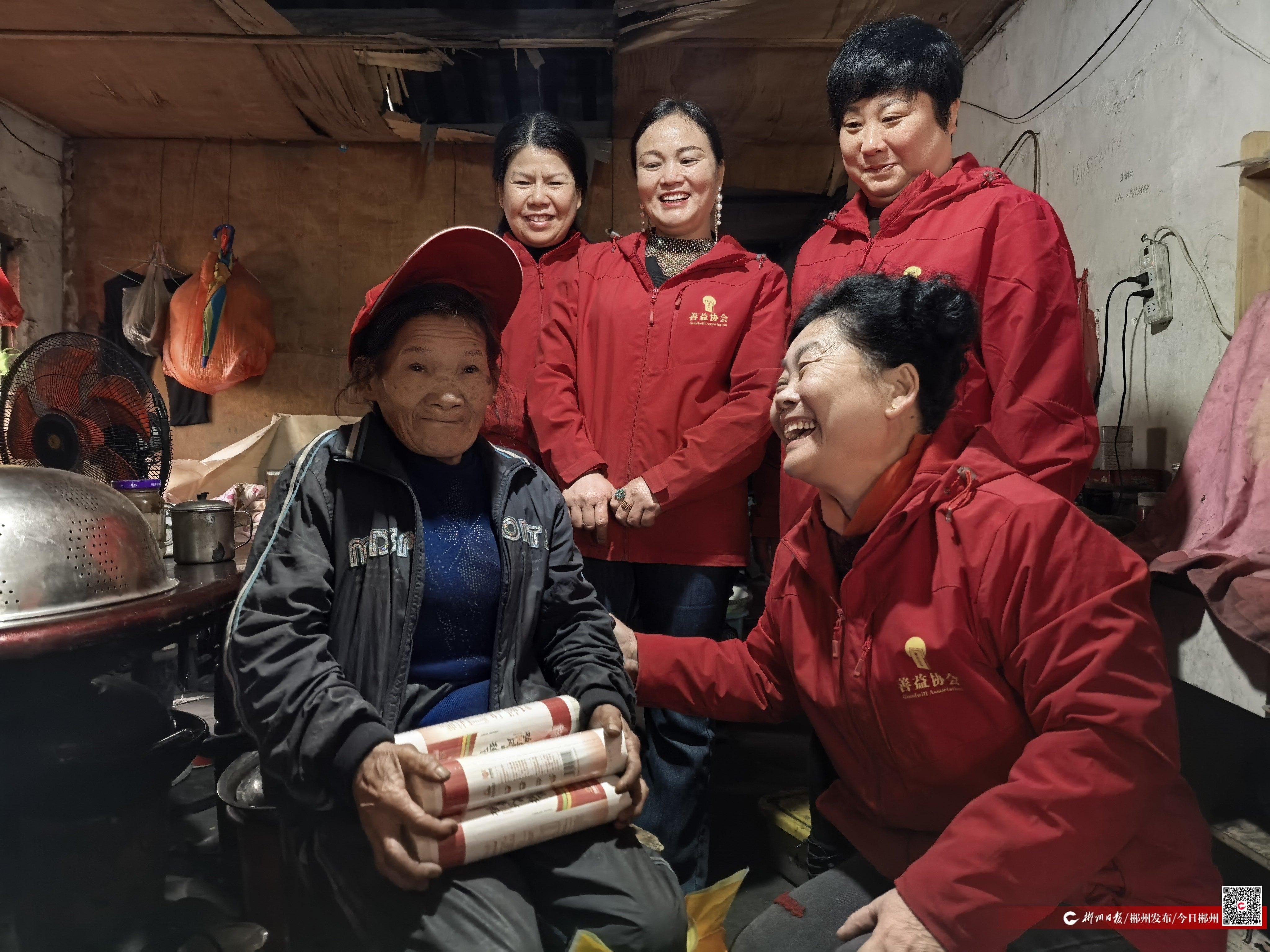 “金凤,开门!是我,满秀来了!”12月17日上午,北湖区郴江街道梨树山小区里,一声熟悉的呼唤传来,62岁的金凤摸索着打开了家门。门外,郴州市善益志愿者协会党支部书记邓满秀和志愿者们带着米、面、油等物资,笑盈盈地等候着。