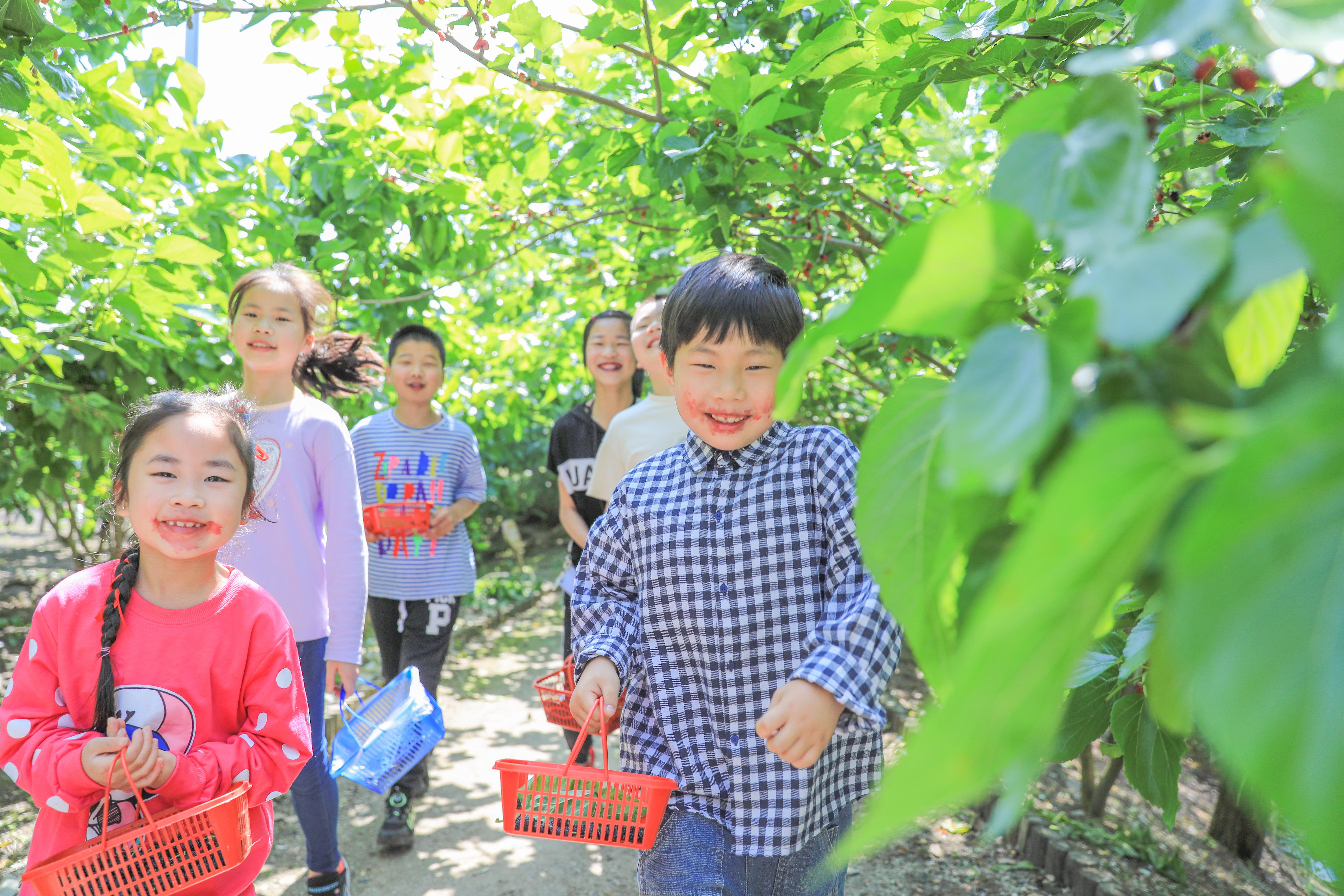 图为夏日桑园里,小朋友们正在体验桑葚采摘之乐 图片由南浔区委宣传部提供