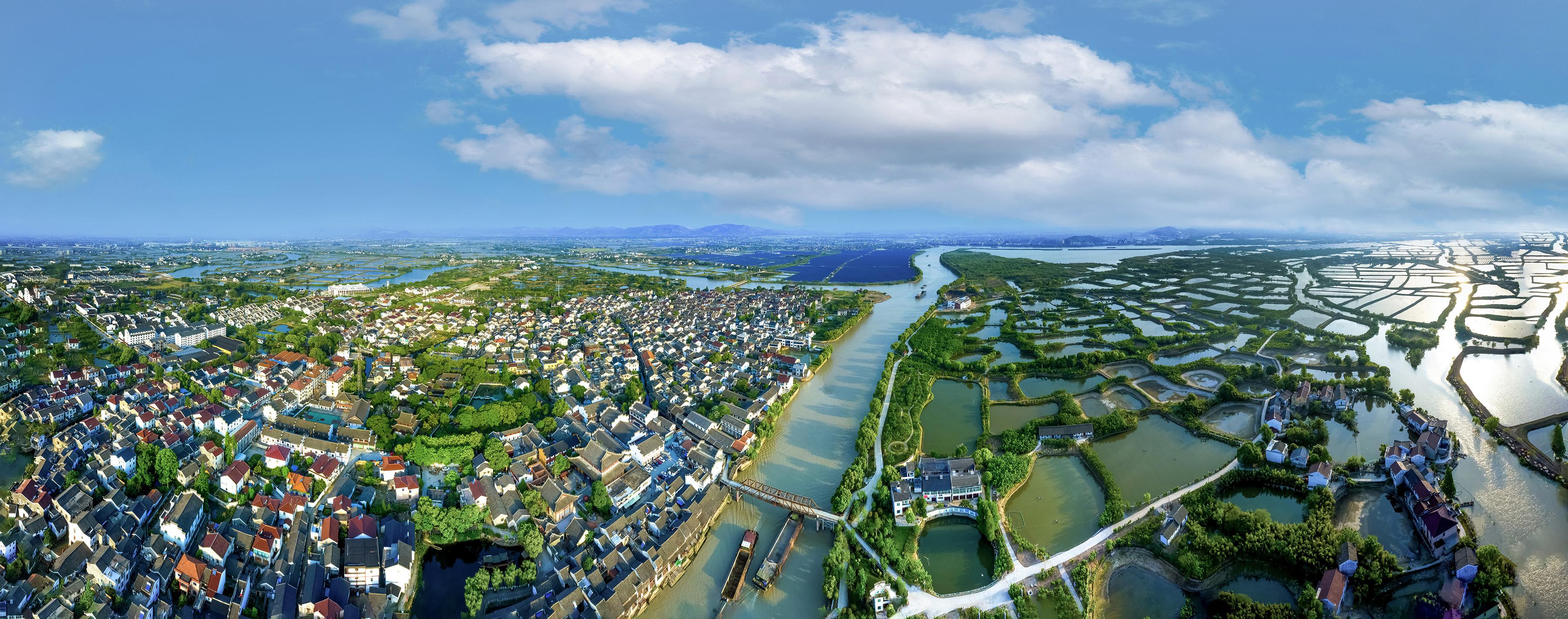 图为荻港千年古村与桑基鱼塘交相辉映 图片由南浔区委宣传部提供
