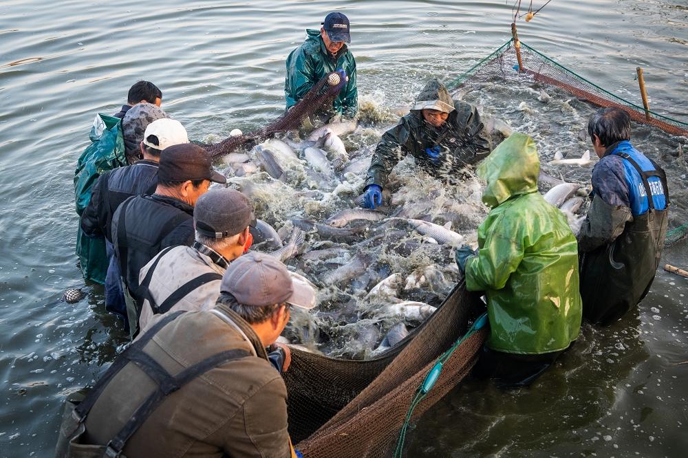 图为荻港村民正在捕桑基塘鱼 图片由南浔区委宣传部提供