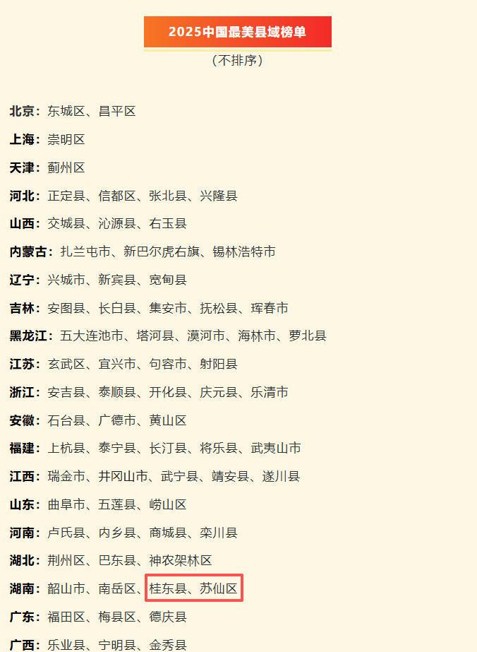 连续入选反映出两地持续推进生态保护与经济发展相融合的成果。近年来,桂东县与苏仙区通过完善基础设施、优化公共服务,不断增强县域综合承载能力,逐步实现生态环境与旅游发展的良性互动。