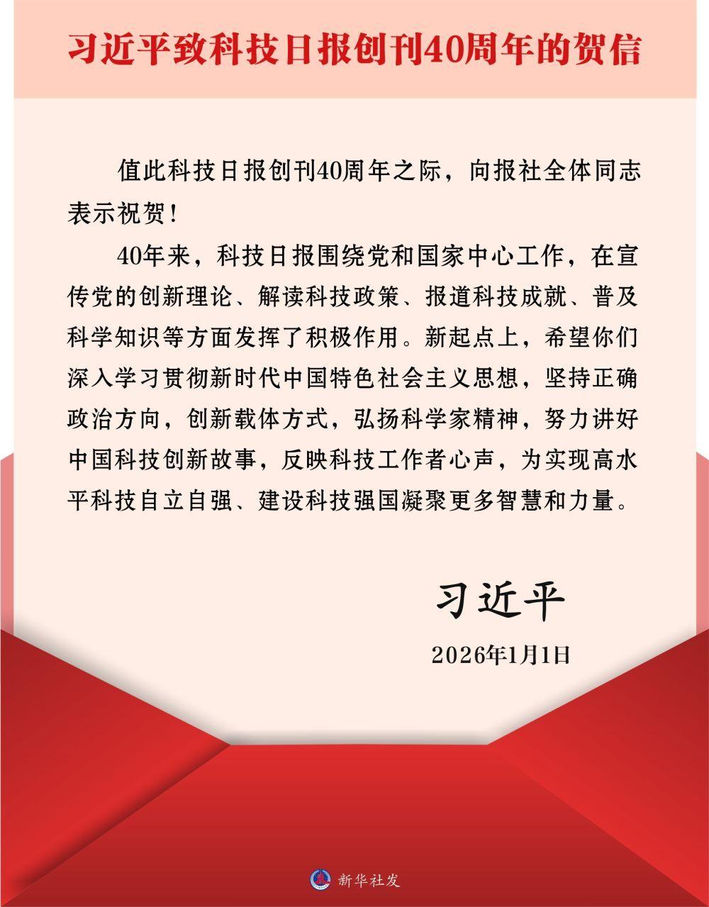 新华社北京1月1日电 在科技日报创刊40周年之际,中共中央总书记、国家主席、中央军委主席习近平发来贺信,向报社全体同志表示祝贺。