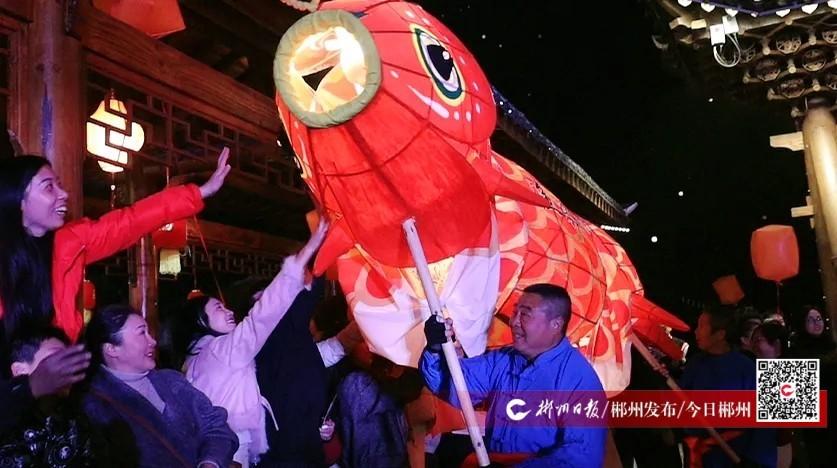 夜幕降临,活动迎来高潮。一盏4.5米长的巨型鱼灯伴随铿锵锣鼓声开启巡游,鱼灯摇曳,身姿缓缓游动,光影交错间宛如从神话中走来。寓意吉祥的鱼灯吸引游客纷纷驻足、拍照记录,在灵动光影中沉浸式感受传统民俗的独特魅力。