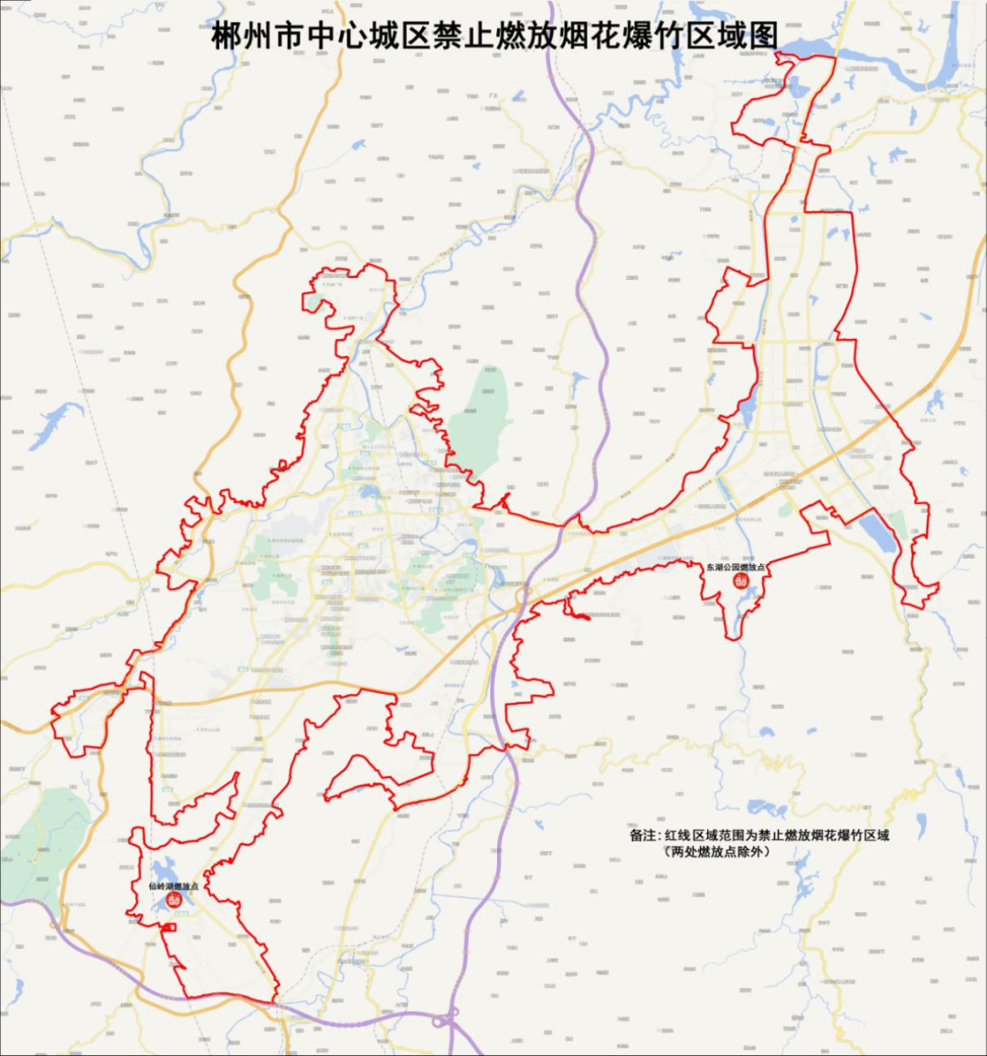 根据2025年12月31日发布的最新《通告》明确规定,郴州市中心城区划定了严格的禁燃区。具体范围为:柿竹园社区—麻田村—苏仙区农垦场—飞天山国家地质公园—郴永大道(雅市村段)—千里湖山—青年大道人民路交会处—卜里坪村—龙女温泉景区—同心桥村—华泰城—雷大桥村—石盖塘村—田家湾村—郴州大道(王仙岭风景区段)—长卷文化旅游度假区—白露塘村—柿竹园社区所形成的对应闭合区域。在上述禁燃区内,禁止任何单位和个人燃放烟花爆竹。同时,为了兼顾市民的节日习俗,市政府特别设立了东湖公园(郴州长卷项目对面区域)、仙岭湖体育休闲公园(石盖塘区域)两处烟花爆竹燃放点。并规定燃放时间为除夕早上6时至次日凌晨1时和正月初一、初二及元宵节每日早上6时至24时。