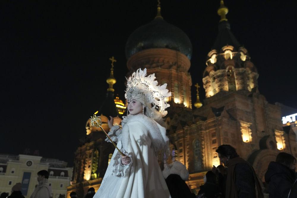 2025年12月15日,游客在哈尔滨建筑艺术广场摄影旅拍。