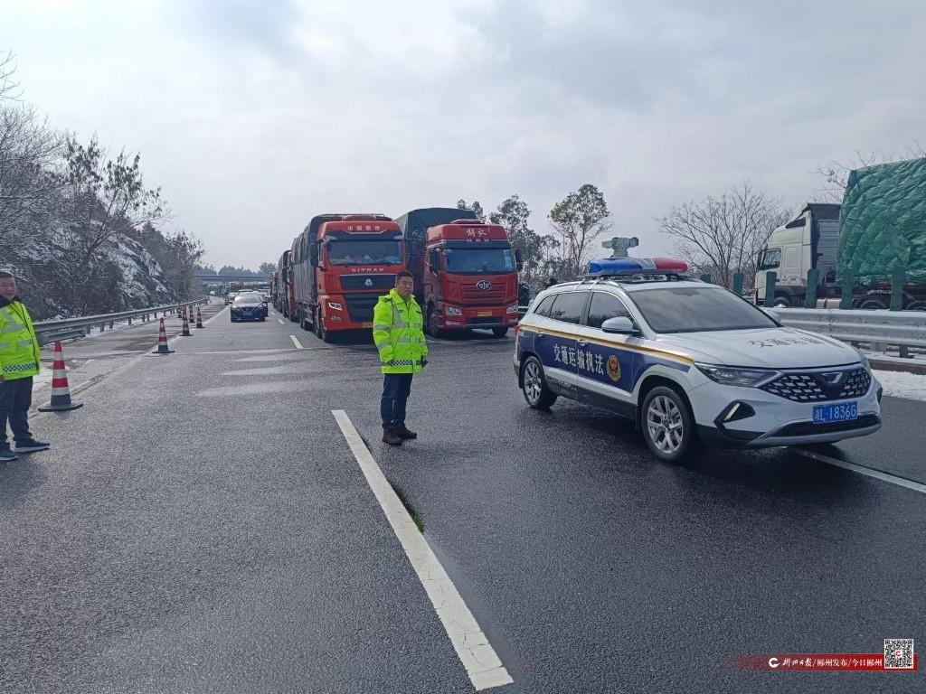 1月21日上午,厦蓉高速宜章路段寒风凛冽,路面出现结冰,市交通运输综合行政执法支队执法人员冒寒驻守现场,耐心引导过往车辆从里田、平和出口有序分流,全力守护道路通行安全。截至目前,全市交通运输系统(含高速)已出动人员1426人次、车辆207台次,聚焦易结冰路段、桥涵、风口路段开展常态化巡查处置。