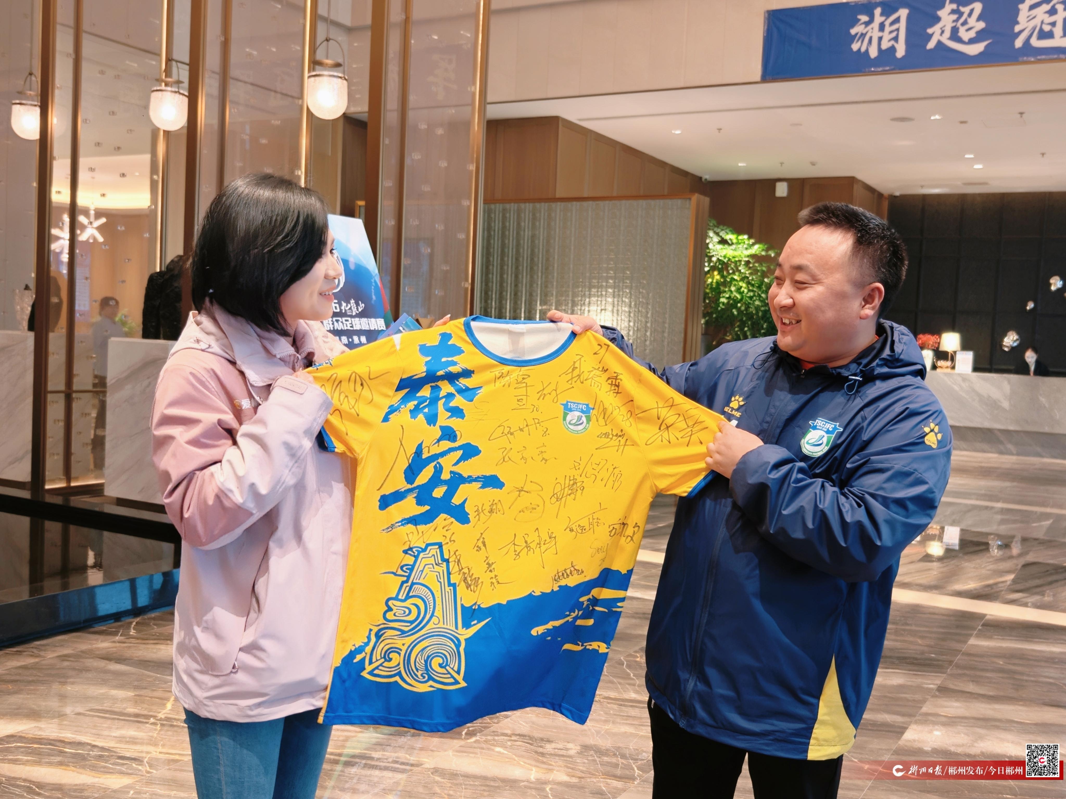 作为受邀队伍之一,山东泰安队不仅表达了对郴州的向往,更发起双向交流邀约。该队主教练李白坦言说:“郴州知名的景区景点特别多,早有耳闻。”“感觉很幸运,受到邀请,有机会欣赏别样的风光。”球员白云飞感慨道。领队张广华则代表球队送上回礼——中华泰山挂画、球队台历和球迷服,“诚挚邀请郴州人民赴泰安旅游,登顶泰山,进行足球交流。”