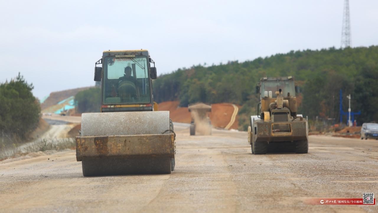 1月23日,在桂新高速桂阳段路面结构层施工现场,多台压路机梯队跟进,按照“先轻后重、先慢后快”原则反复碾压,确保路面基层平整坚实。施工班组全效运行时,每天可完成约2公里的水稳层铺设任务。“路基交验完以后,就开始铺设水稳料,已经铺设了两层水稳。”桂新高速公路项目总包部协调部部长孙小军介绍道,预计今年春节后开始铺设沥青。