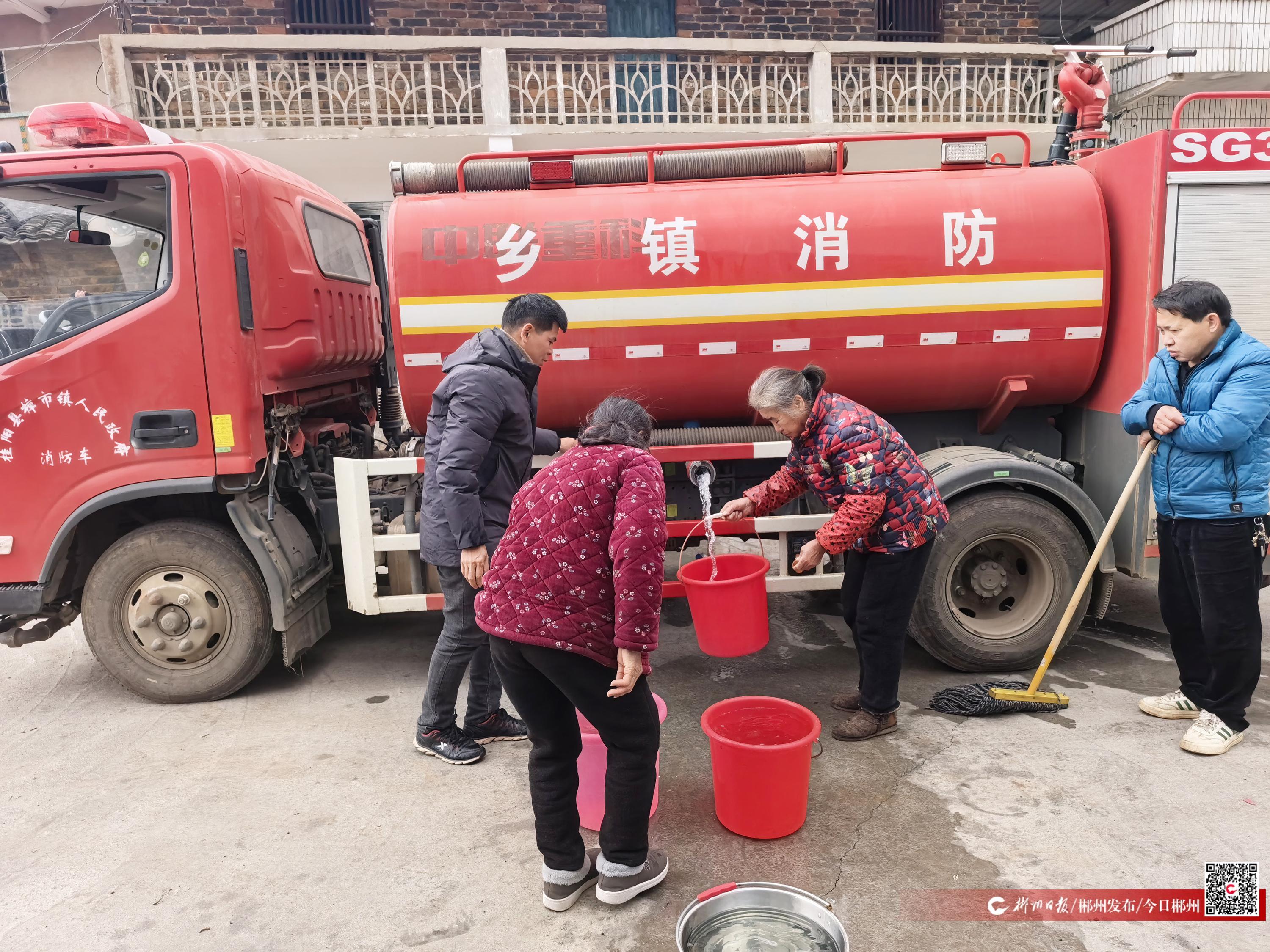 1月23日,桂阳县樟市镇梅塘村,一辆满载清水的消防车在覆冰的村道上缓慢前行,将生活用水精准送到村民家门口,及时解决了群众的用水难题。