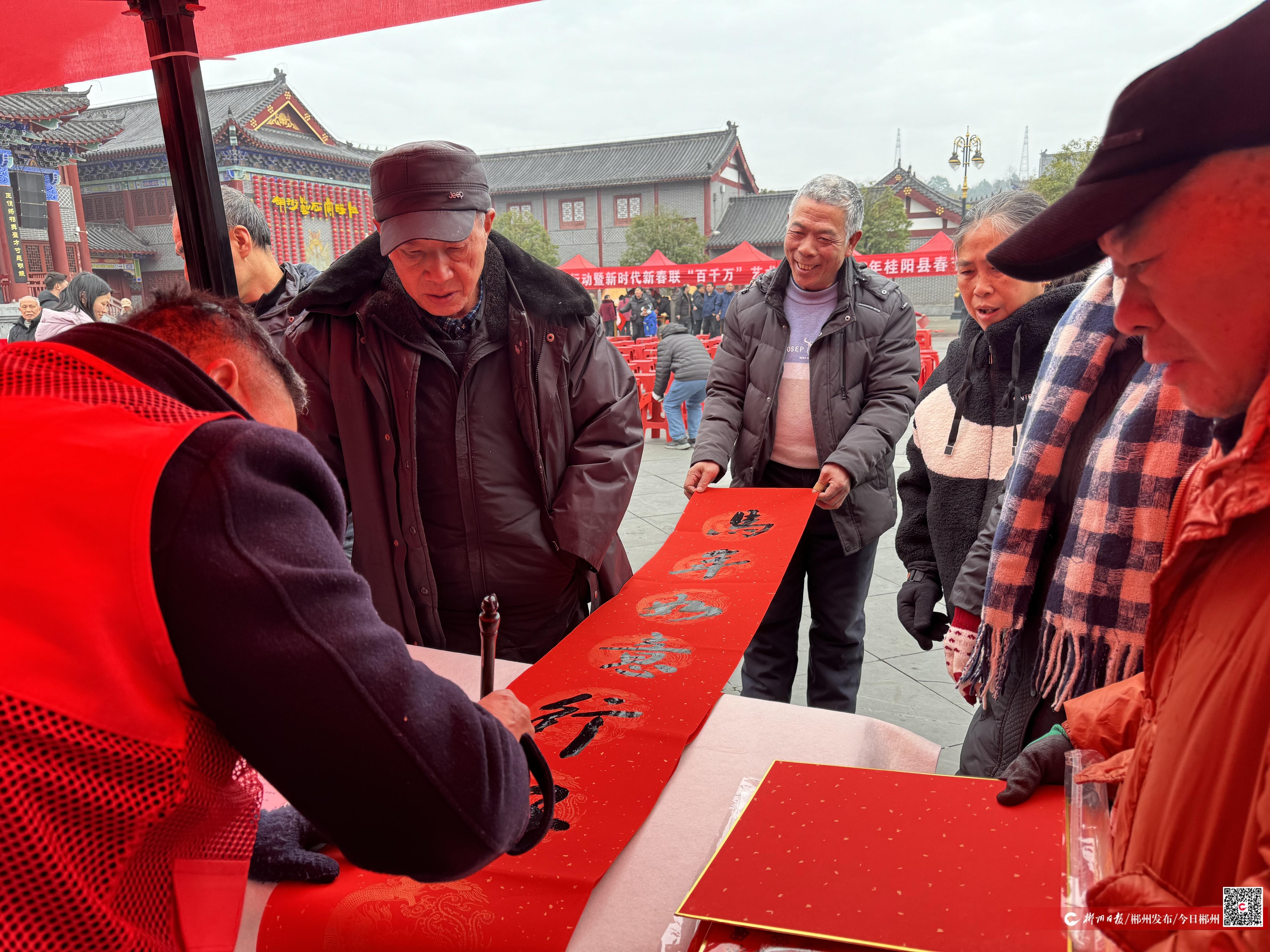活动紧扣惠民主题,现场设置了多项群众喜闻乐见的环节。戏台上,桂阳县湘剧保护传承中心的演员们献上了精彩的演出,歌伴舞、独唱、快板、小品等节目精彩纷呈。戏台下,长桌一字摆开,文艺志愿者铺纸研墨,楷、行、隶、草等多种书体,各显神韵。一副副满载祝福的春联、一张张承载希望的“福”字,充满了浓浓的年味儿。大家捧着春联,喜上眉梢。