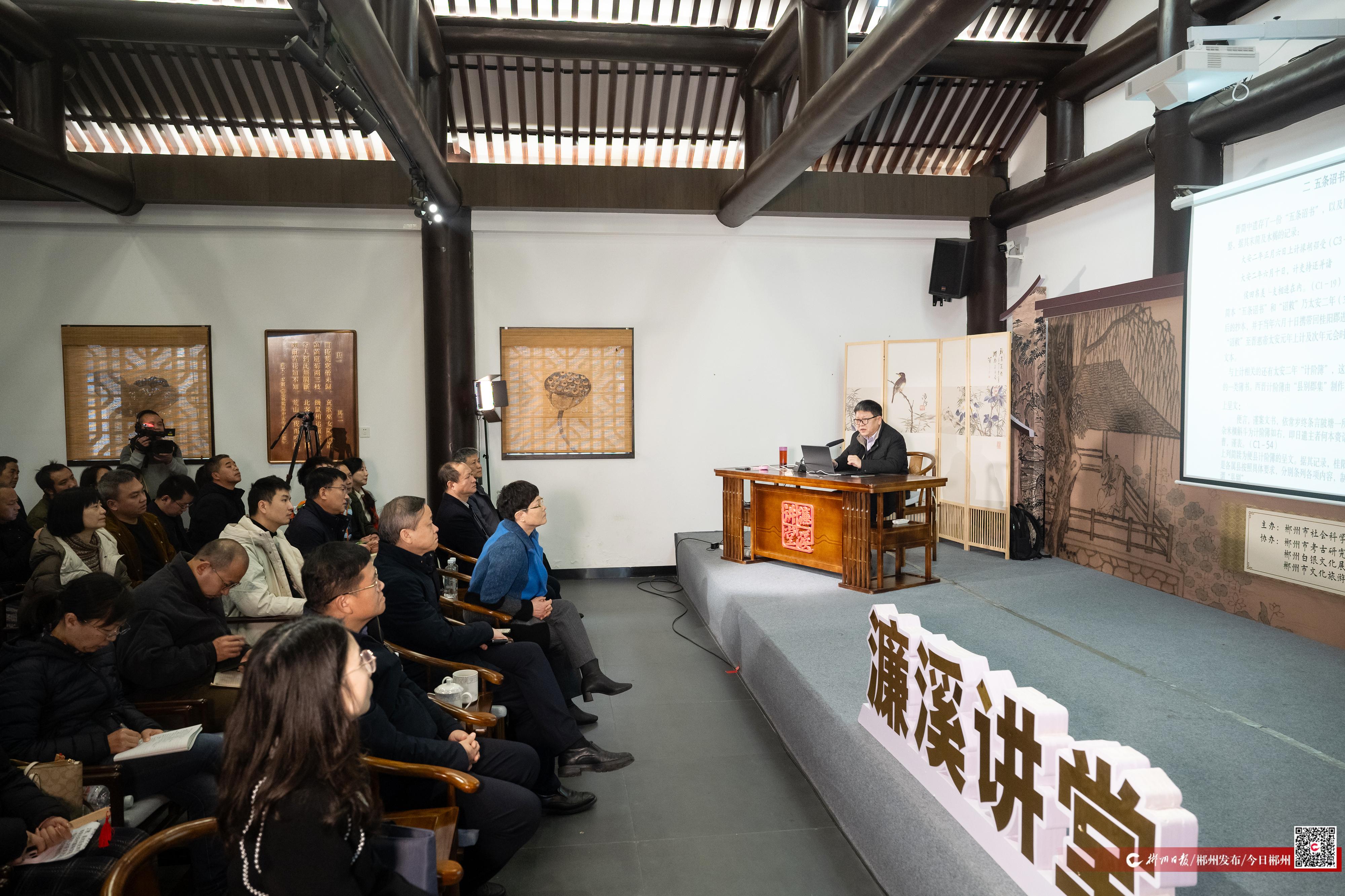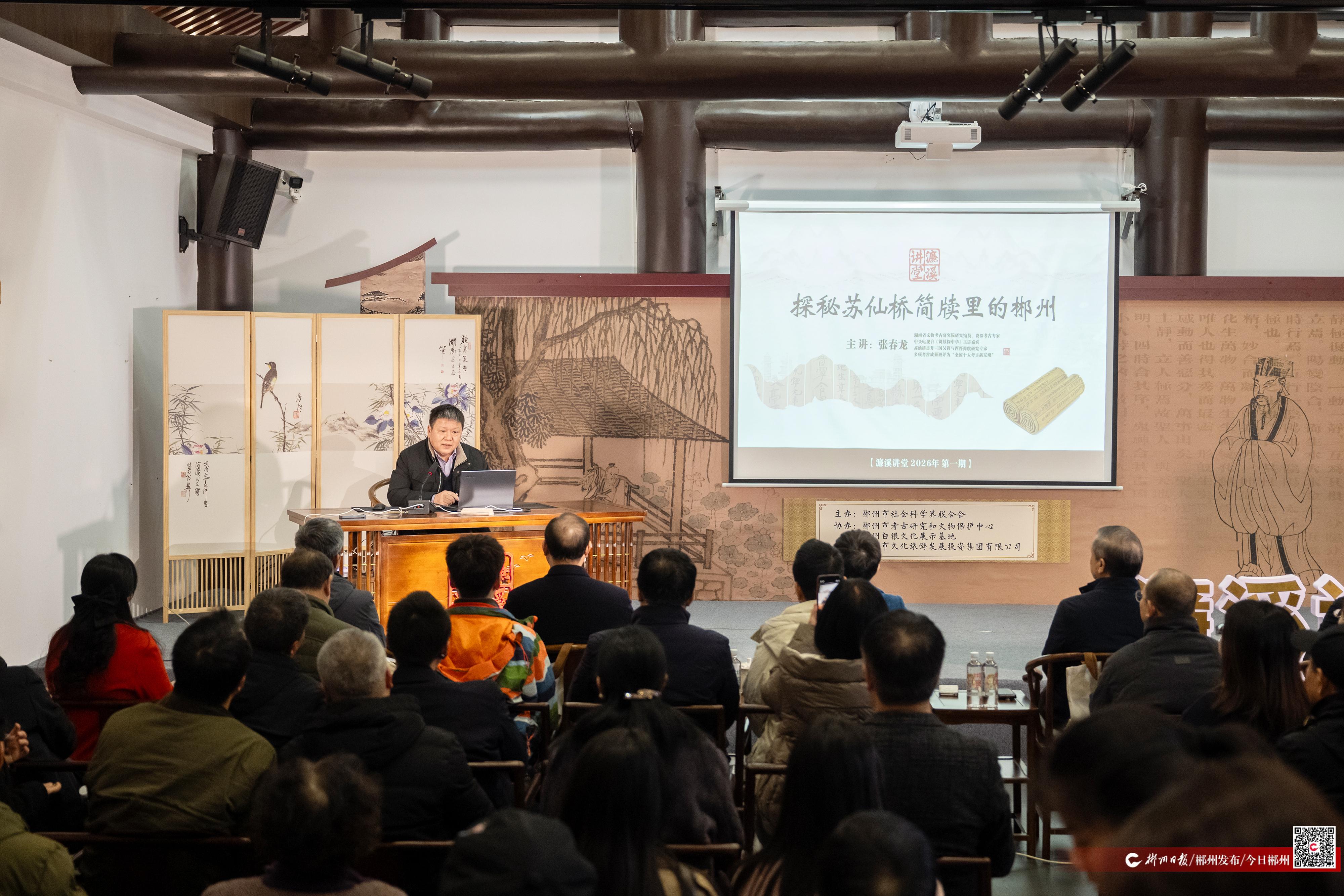 “郴州是湖南历史文化名城,是经济文化荟萃之区。这批简牍的发现,极大地丰富了郴州的历史记忆。”1月29日下午,郴州爱莲湖濂溪书院内座无虚席,2026年第一期濂溪讲堂在这里开讲。当主讲人——湖南省文物考古研究院研究馆员张春龙打出“探秘苏仙桥简牍里的郴州”主题时,台下响起一片期待的轻语声。不少观众提前打开了笔记本,准备记录这场穿越千年的对话。