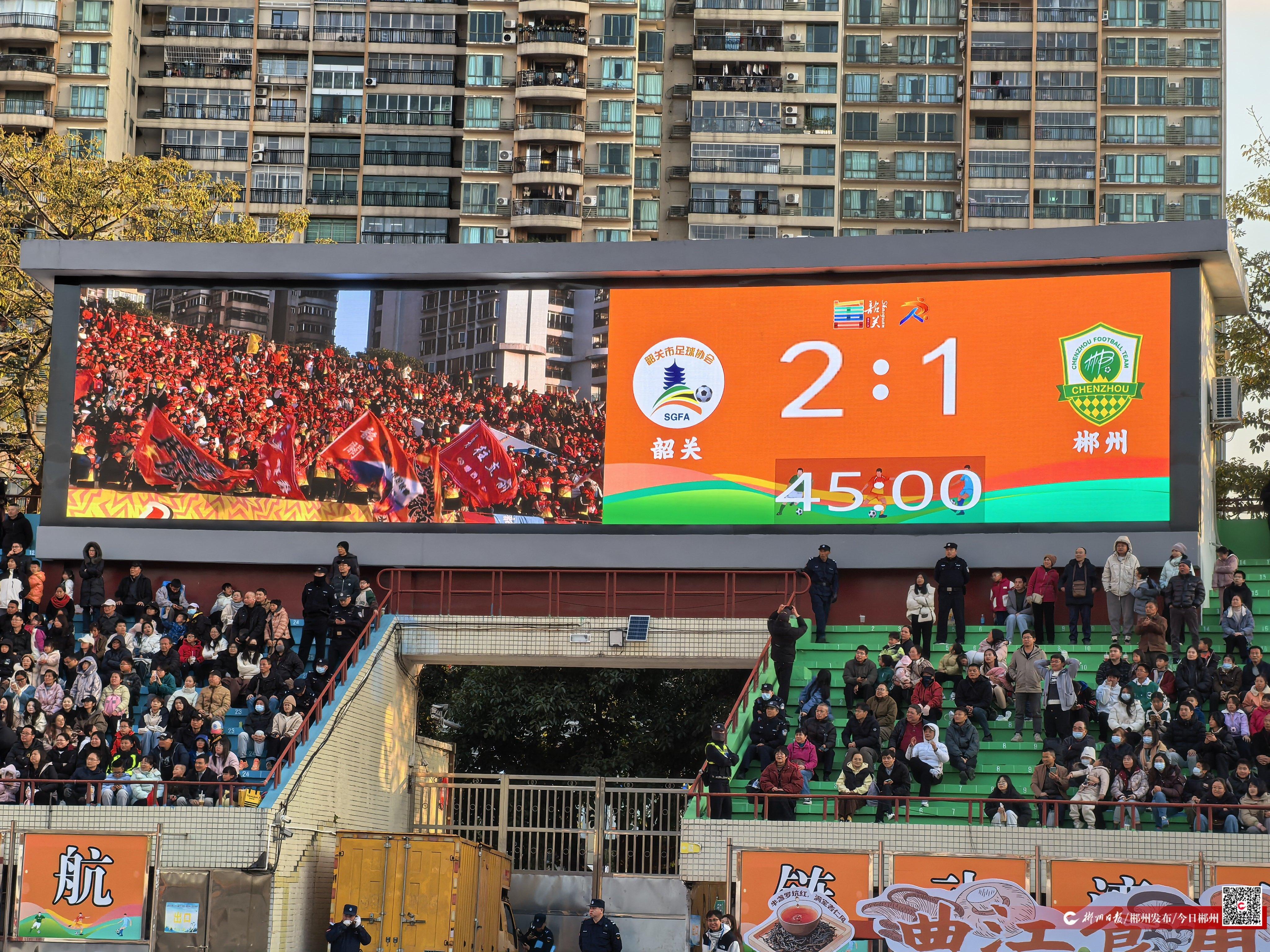 下半场易边再战。坐镇主场的韶关队掌握场上主动权,凭借默契的团队配合向郴州队发起攻势;郴州队则稳扎防线,伺机反击。第53分钟,韶关队开出角球,韶关队队员头球攻门,皮球高出横梁。第61分钟,韶关队开出任意球,郴州队防守失误,韶关队39号韩博门前推射破门,2:1韶关队反超比分。第70分钟,郴州队快速反击,8号蒋政在禁区内接队友巧传,顺势转身一脚射门,皮球高出横梁,错失扳平比分的机会。补时阶段,郴州队边路起球,禁区内一片混战,韶关队将球破坏。最终,郴州队1:2惜败韶关队。