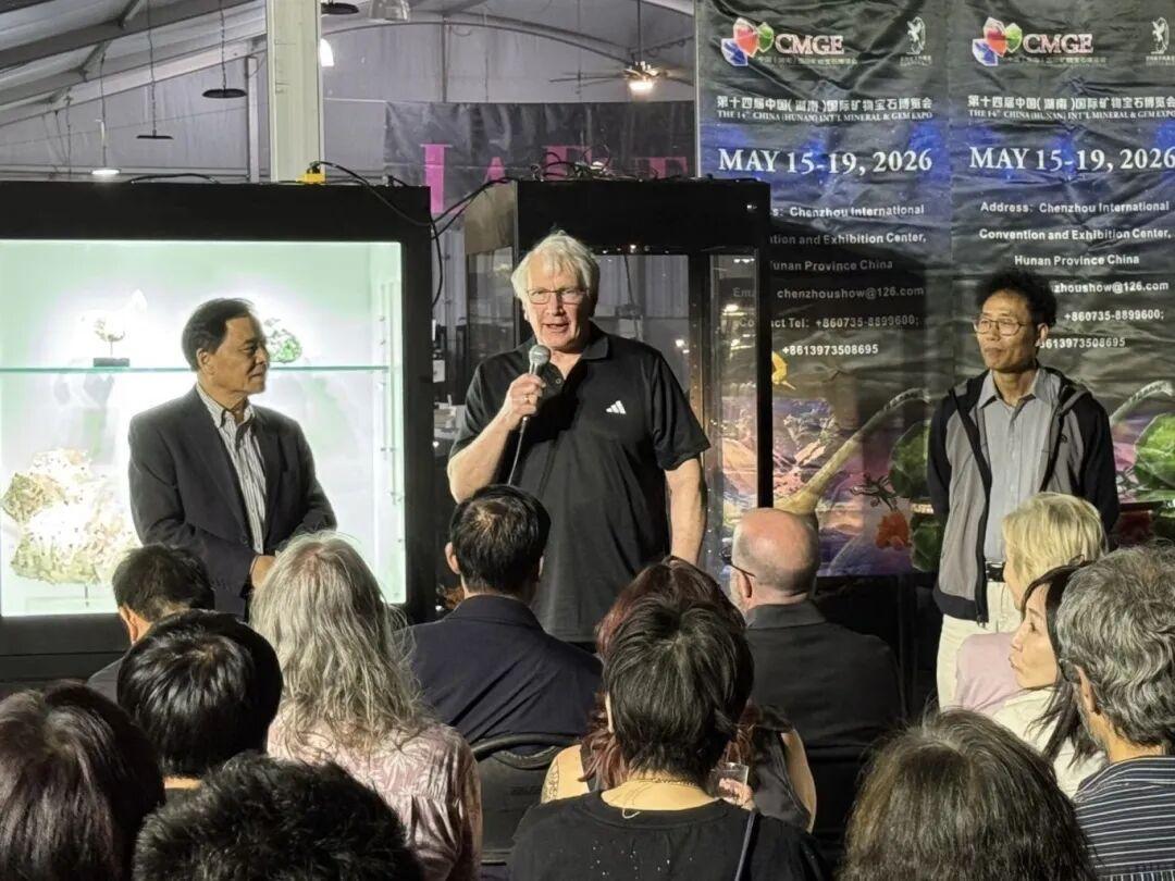 国际顶级收藏家纷纷为矿博会点赞。美国阿肯斯通矿物公司总裁罗伯特·莱温斯基分享了与郴州矿博会的合作经历,盛赞中国矿物标本的独特魅力与收藏价值,明确表示将持续支持第十四届矿博会,助力全球矿业文化交融互鉴。达拉斯佩罗自然科学博物馆前馆长马克·波普西西尔也发表致辞,对展会举办表达热切期待,高度认可其在全球矿业收藏领域的平台价值。