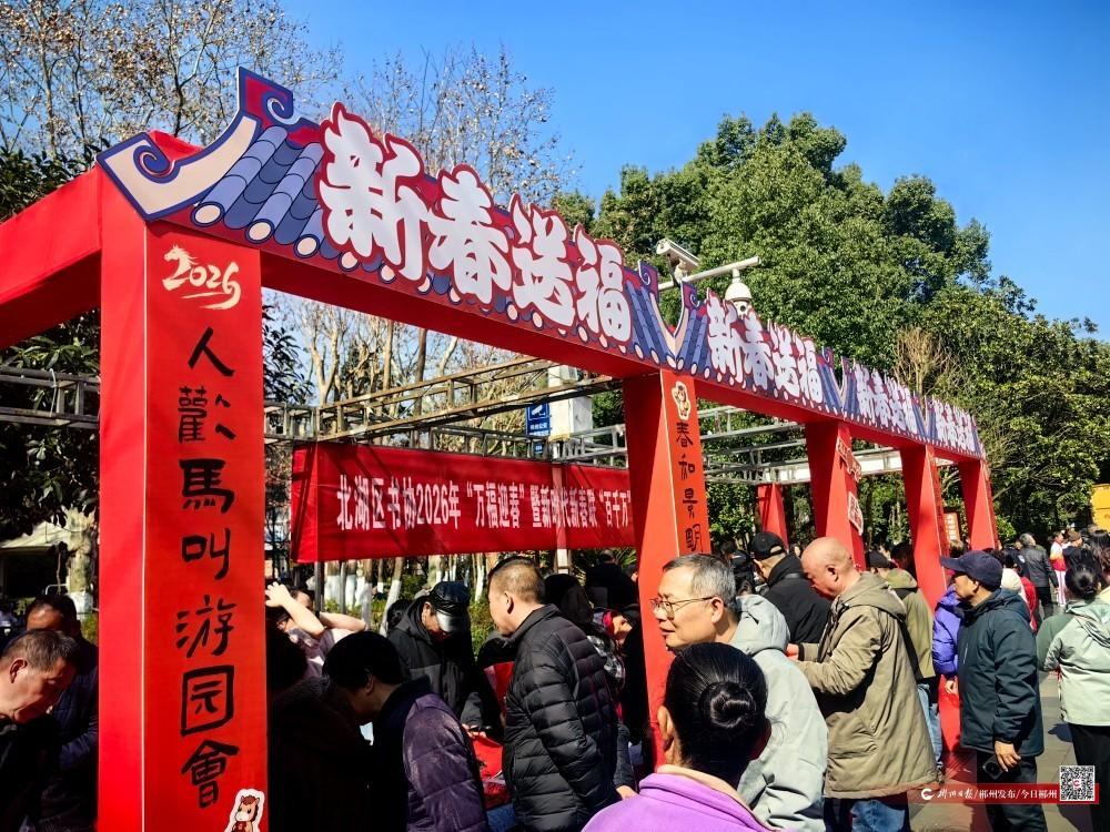 春意渐浓,年味正酣。2月3日,北湖公园内暖意融融、人声鼎沸,一场新春送福活动热闹展开。活动以写春联、送“福”字为核心,结合特色文明集市与非遗集市,为市民送上兼具文化韵味与烟火气的新春祝福。