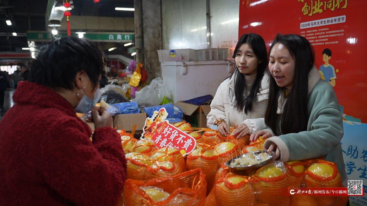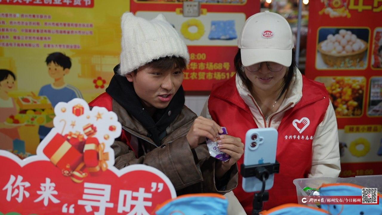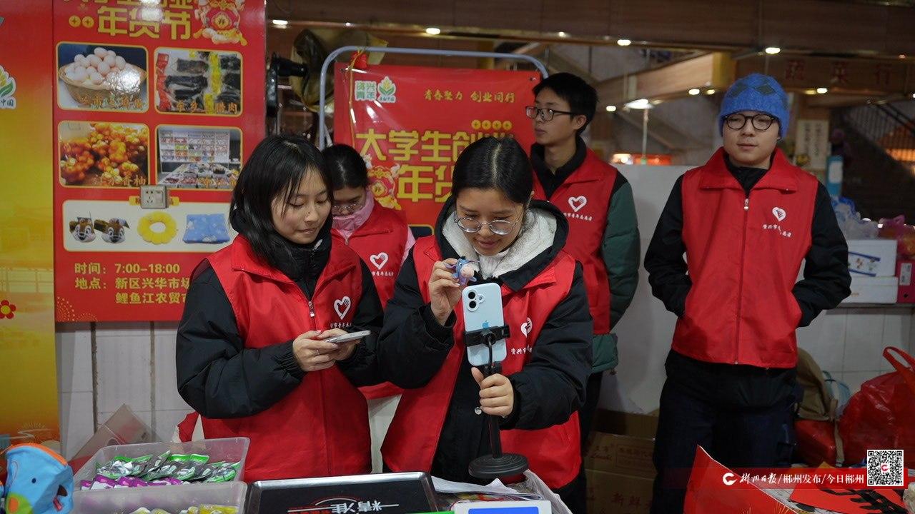 连日来,在资兴市两大农贸市场的年货节现场,处处可见返乡大学生穿梭忙碌、朝气蓬勃的身影,成为年货节上一道亮丽的青春风景线。他们熟练地架起补光灯、对准摆满特产的展台,化身元气满满的助农主播,将课堂上学到的市场营销、视觉设计、数据分析等知识灵活运用于实践。镜头前,有人手持腊肉展示肥瘦相间的纹理,有人举起糍粑演示软糯吃法,还有人生动讲解东江福鱼、东乡土腊肉、糍粑等本地特色农产品的由来与风味,让以往“藏在深山人未识”的家乡特产通过直播成为网红爆款。线上订单一路攀升,不少特产刚上架就被抢购一空。