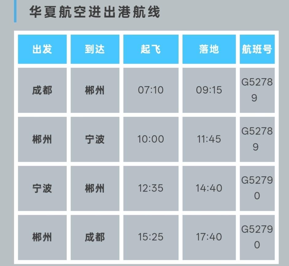 去程G52789:成都天府07:10起飞,09:15抵达郴州;郴州10:00起飞,11:45抵达宁波。