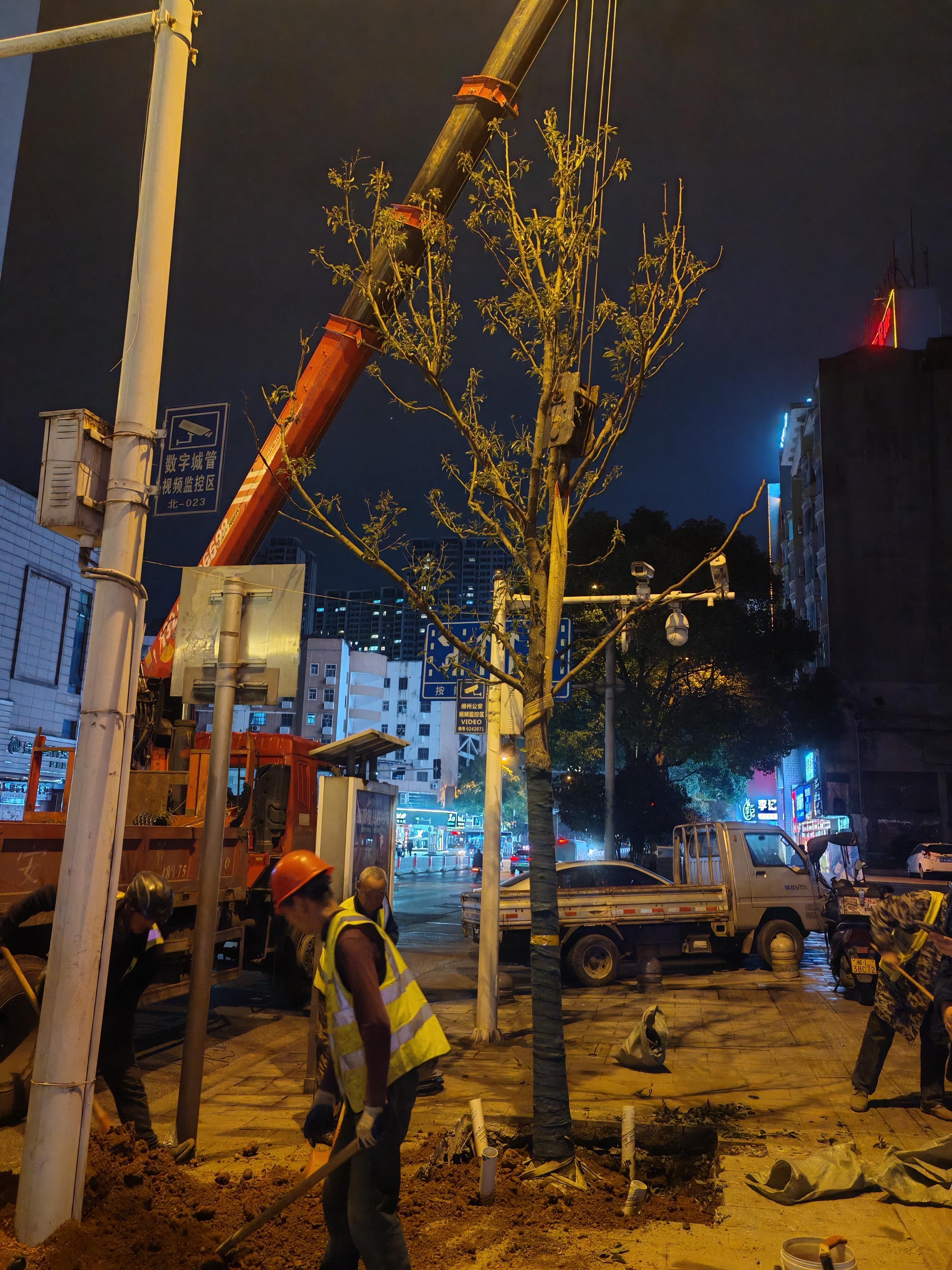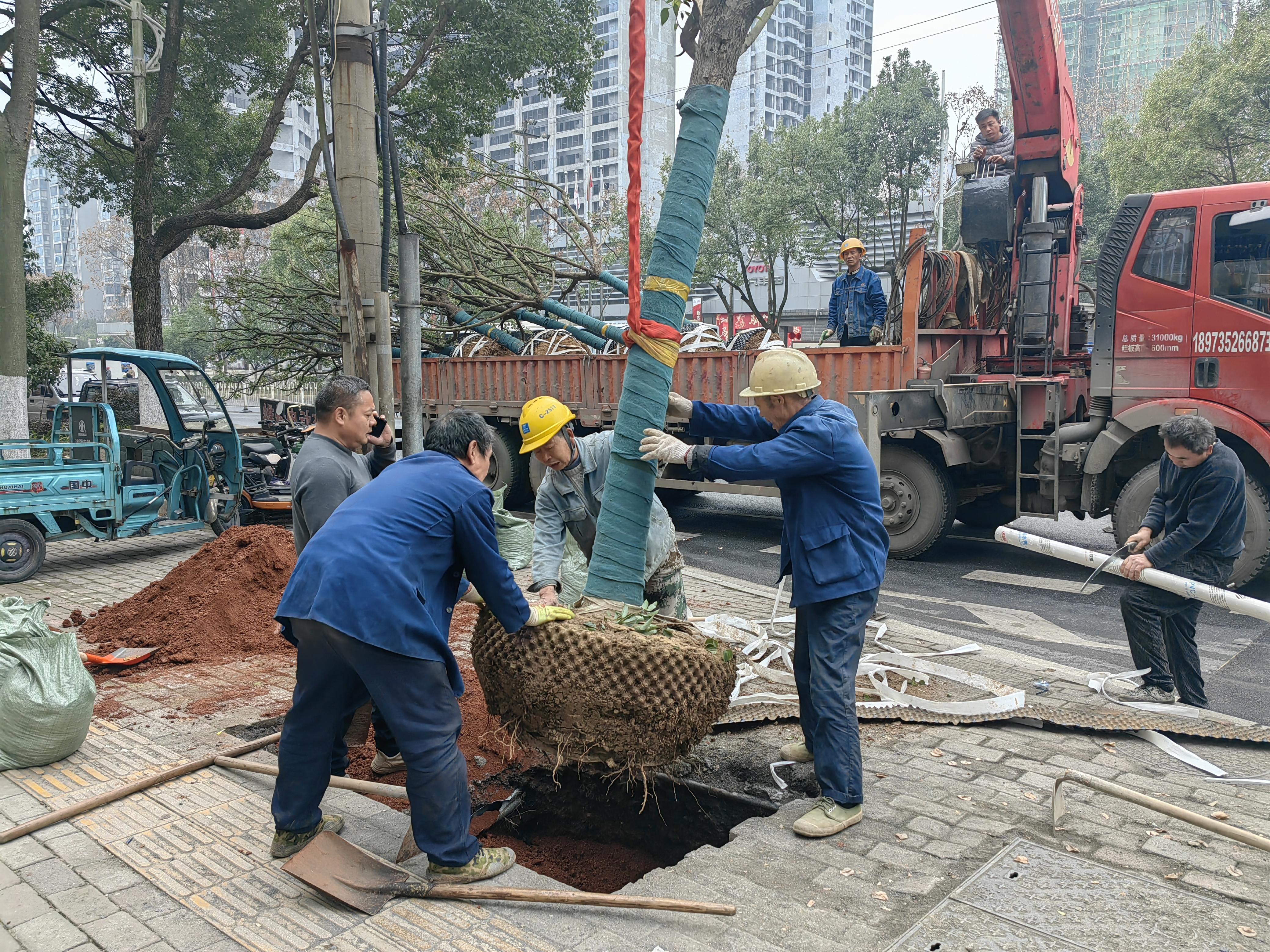 面对紧张的工期,施工队伍连续作业,有序推进各项工作。施工现场包括破除路面、开挖树穴、吊运苗木、扶正培土、浇灌定根水及铺设树池砖等环节,各工序按规范实施,确保新栽树木稳固扎根。