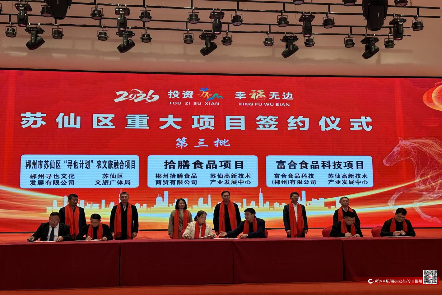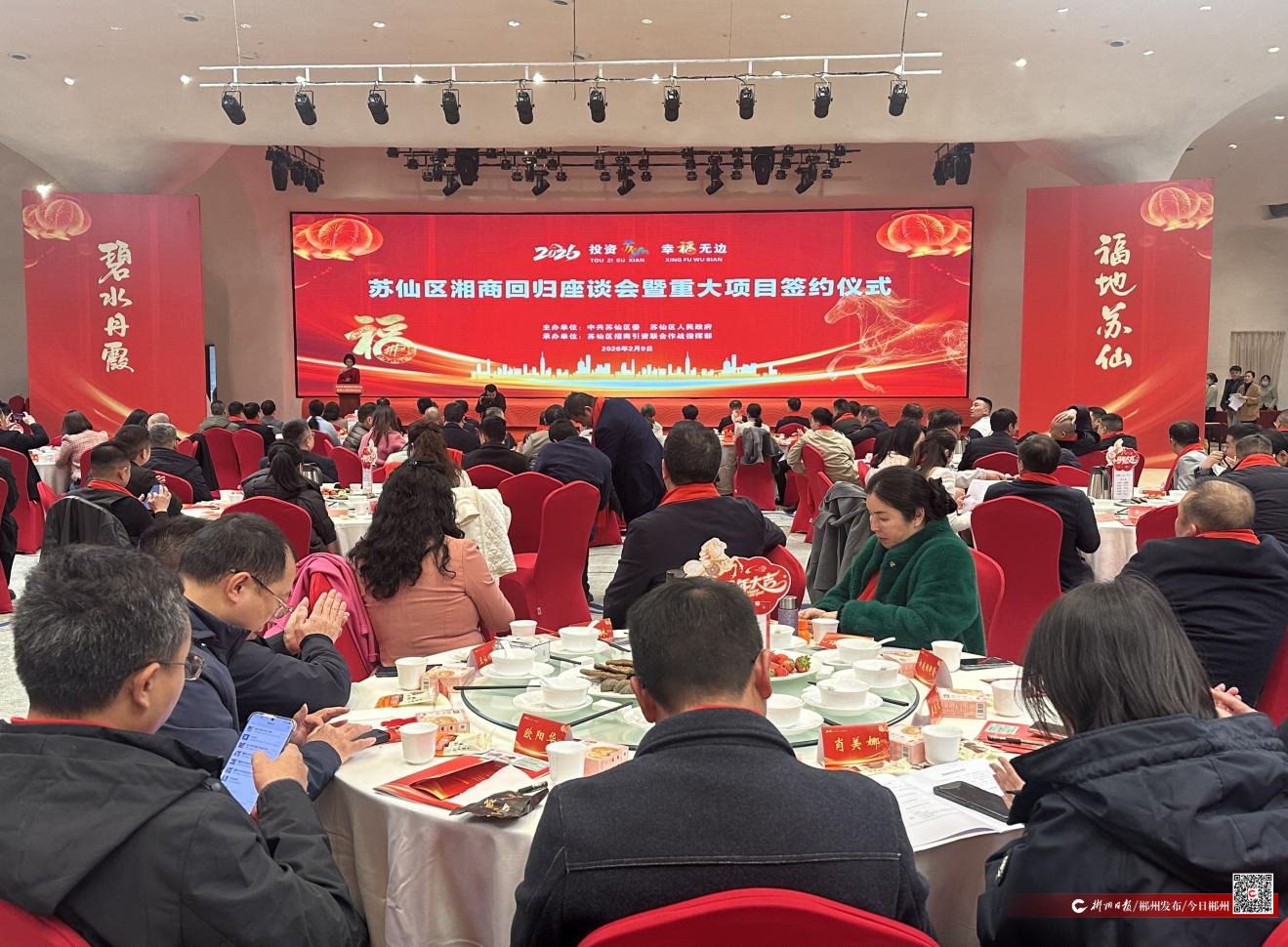 2月9日下午,苏仙区举行“投资苏仙 幸福无边”湘商回归座谈会暨重大项目签约仪式,160余位政企代表齐聚,共叙乡情、共商发展。