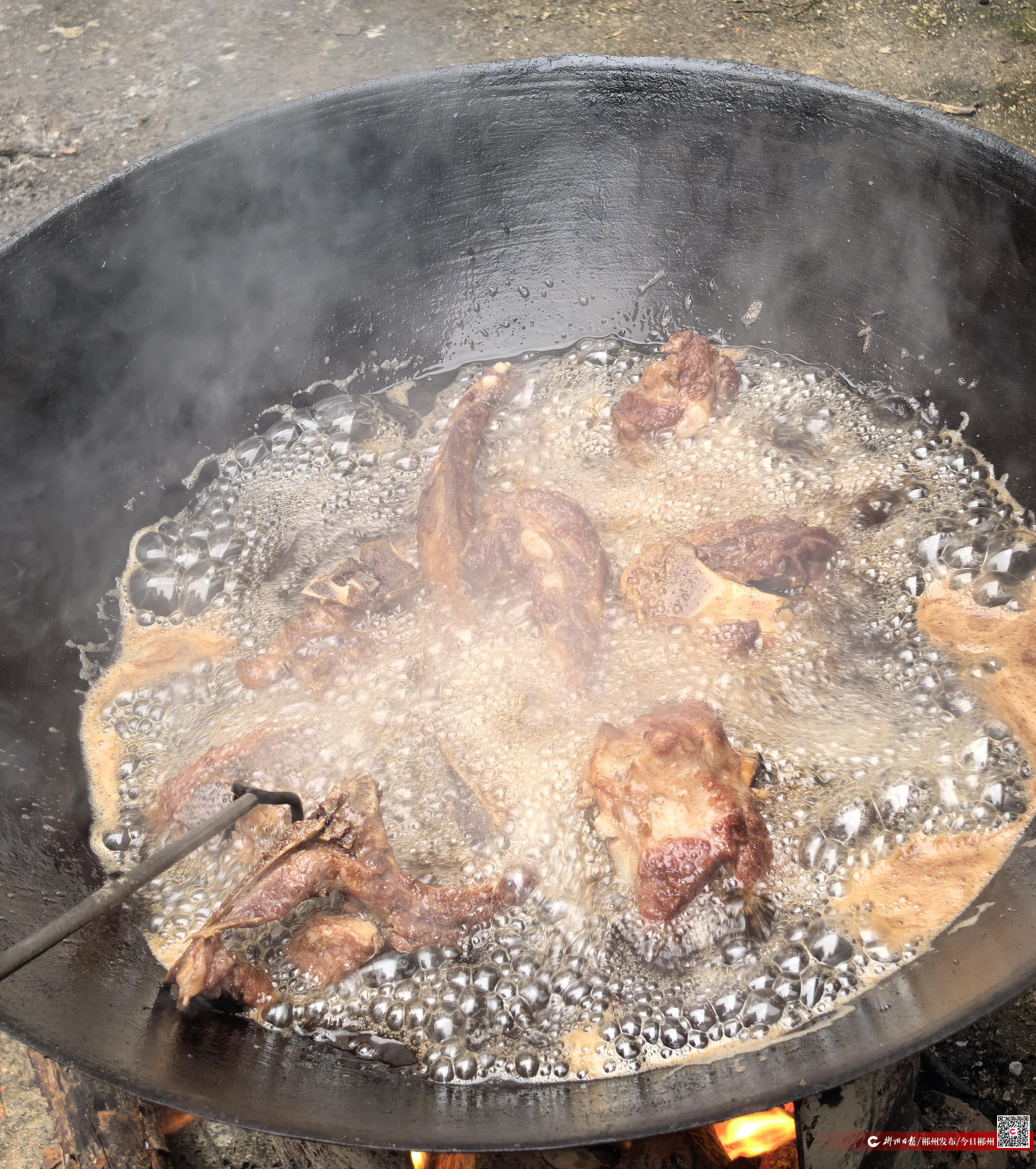 灶膛里柴火噼啪作响,大铁锅烧得滚烫。儿子李四平接过肉块,下锅焯水去血沫,他介绍道,桂阳过年肉讲究用料,要选本地土猪五花肉,先焯后蒸,再用茶油慢煸,做出来才能肥而不腻、油亮入味。随着油温升高,浓郁肉香渐渐弥漫整个小院,引得一旁玩耍的孙辈不时探头张望。