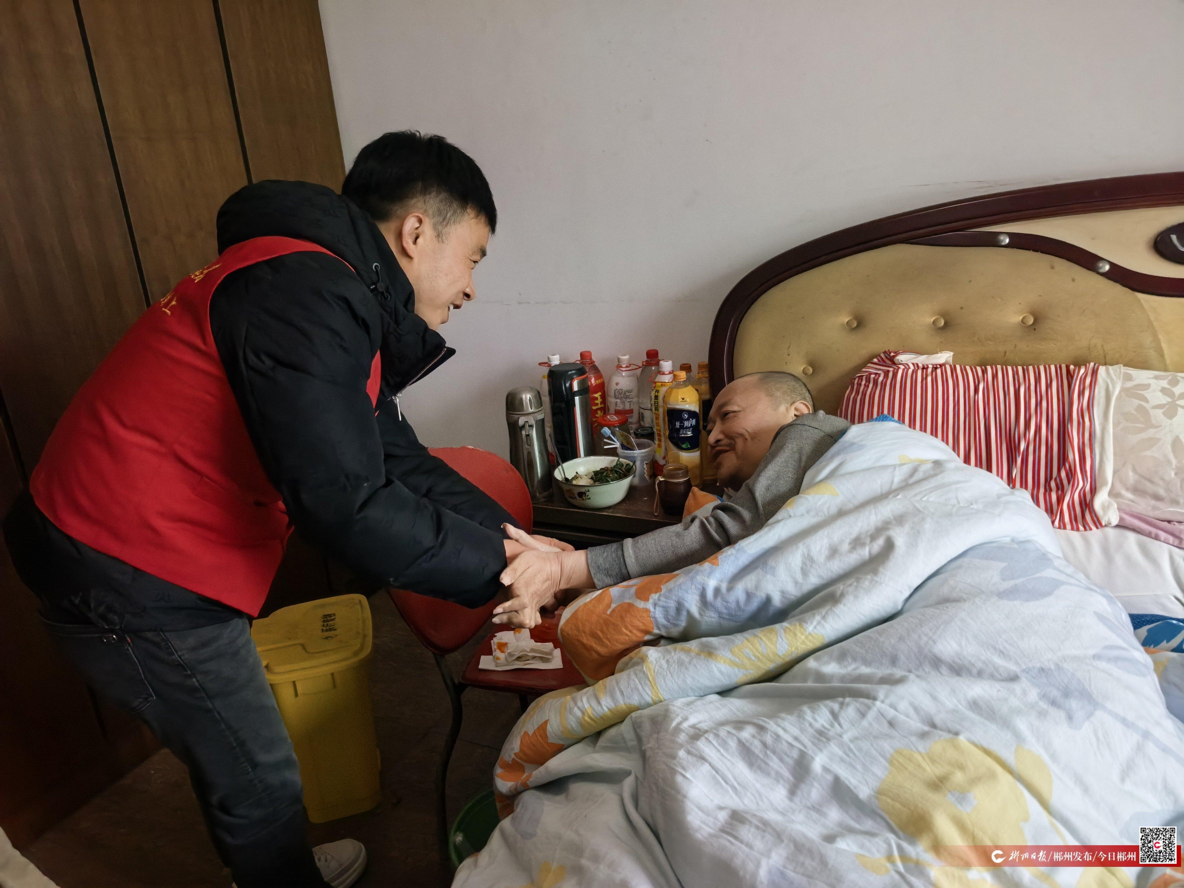 春联贴好,廖锋华把带来的米、油、橘子一一放进厨房,他轻手轻脚地走进主卧,握住床上陈德生有些瘦削的双手:“陈大哥,小年好啊,我们来看您了。”陈德生眼眶微热:“谢谢你!难为你总是记挂着我们,有你们这些志愿者,真好!”
