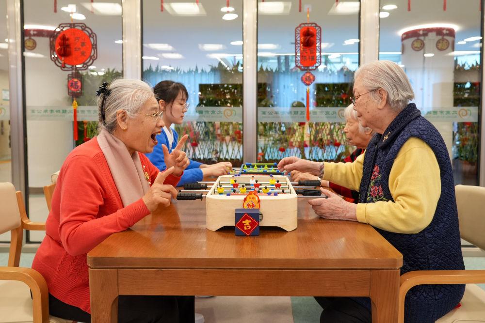 2月10日,社区内老年人玩益智游戏。