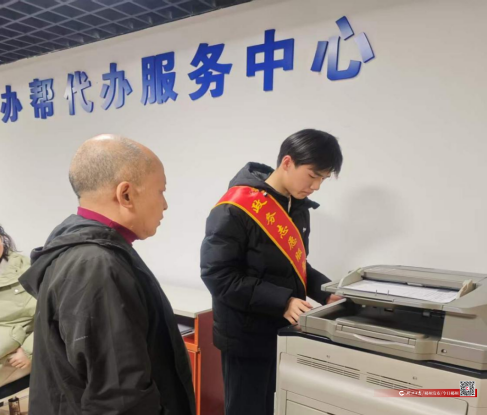 服务现场,身着统一标识的大学生志愿者活跃在各岗位,他们主动提供咨询引导、自助办理、帮办代办、秩序维护等服务,耐心解答群众疑问,协助填写表单、操作设备。针对老年人等特殊群体提供“一对一”陪办,用热情与细心温暖民心。