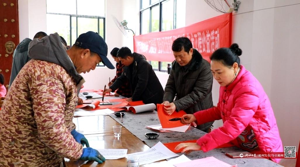活动中,几名年轻人在石臼边轮番挥杵,将蒸熟的糯米捶打成软糯的糍粑;手作台前,村民正将面团“编”成一个个中国结造型的套花。不远处,几位书法爱好者泼墨挥毫,将墨迹未干的“福”字和春联递到村民手中。